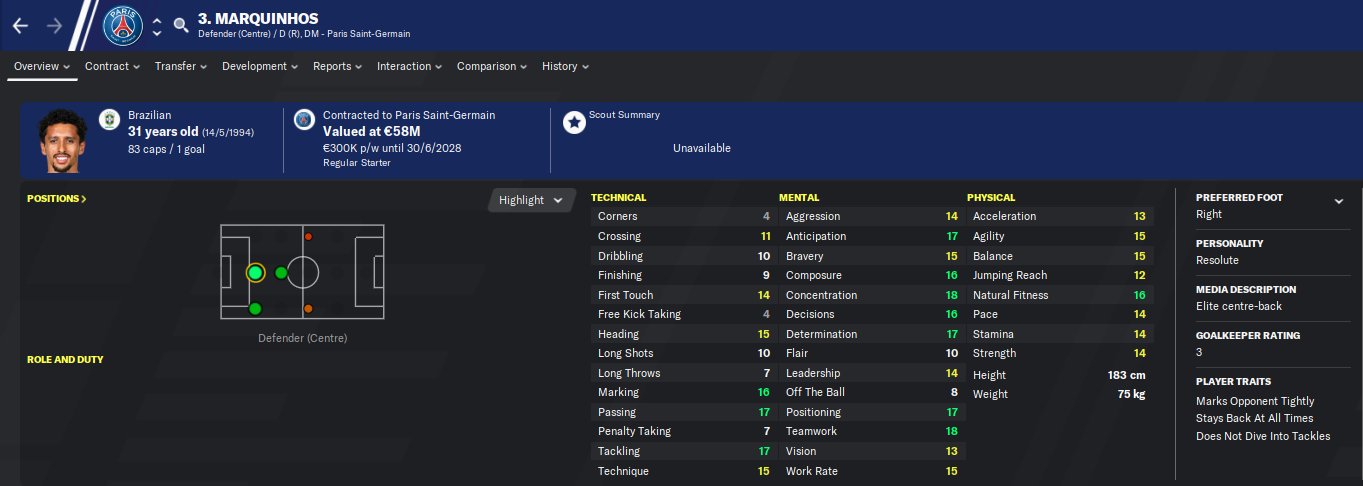 Marquinhos profile in Football Manager 2024. Marquinhos is a 25 years old professional footballer from Brazil. His preferred foot is Right and his best role is No-Nonsense Full-Back. In the first season of FM24, he is contracted to Paris SG until 30-Jun-2024 earning £238K per week and has a market value of 44M. You can help him reach his full FM24 potential with proper training.