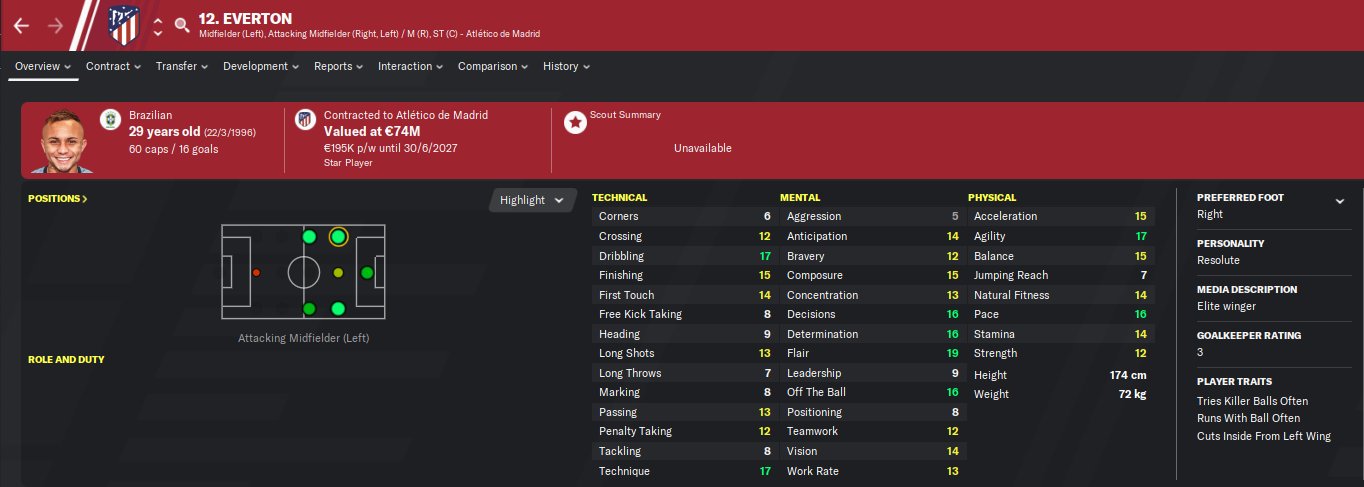 Everton profile in Football Manager 2026. Everton is a 23 years old professional footballer from Brazil. His preferred foot is Right and the best role is Inside Forward. In the first season of FM26, he is contracted to GRE until 31-Dec-2023 earning £26K per week and has a market value of 15M. You can help the player reach that full FM26 potential with proper training.