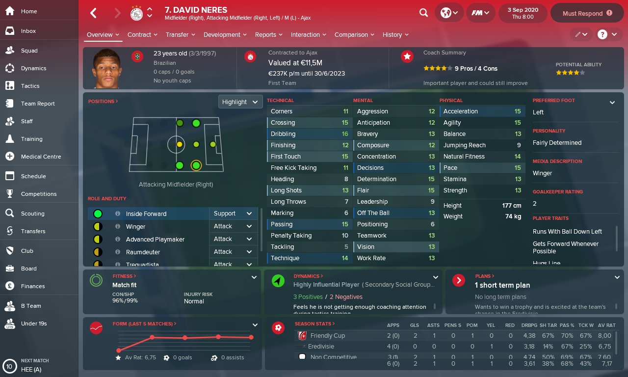 David Neres profile in Football Manager 2026. David Neres is a 20 years old professional footballer from Brazil. His preferred foot is Left and the best role is Winger. In the first season of FM26, he is contracted to Ajax until 30-Jun-2021 earning £11K per week and has a market value of 7M. You can help the player reach that full FM26 potential with proper training.