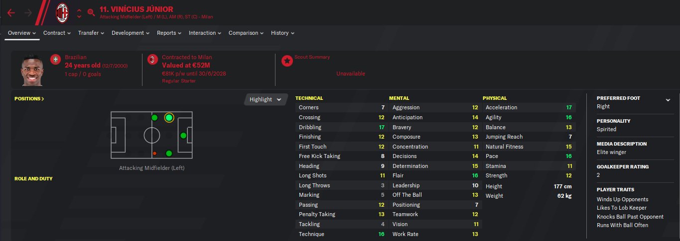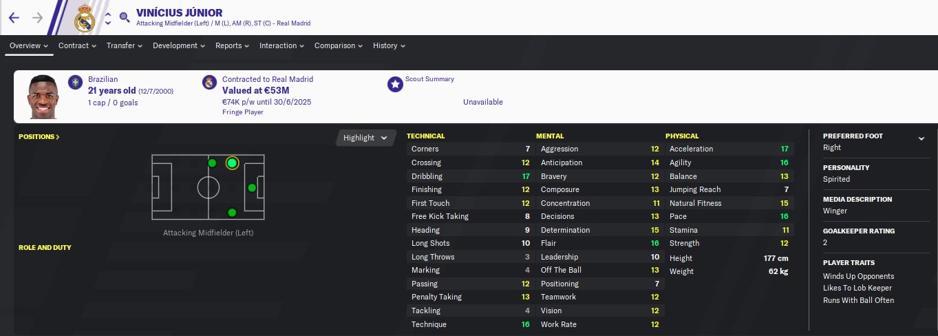 Vinicius Junior profile in Football Manager 2026. Vinicius Junior is a 18 years old professional footballer from Brazil. His preferred foot is Right and the best role is Inside Forward. In the first season of FM26, he is contracted to R. Madrid until 30-Jun-2025 earning £59K per week and has a market value of 22M. You can help the player reach that full FM26 potential with proper training.