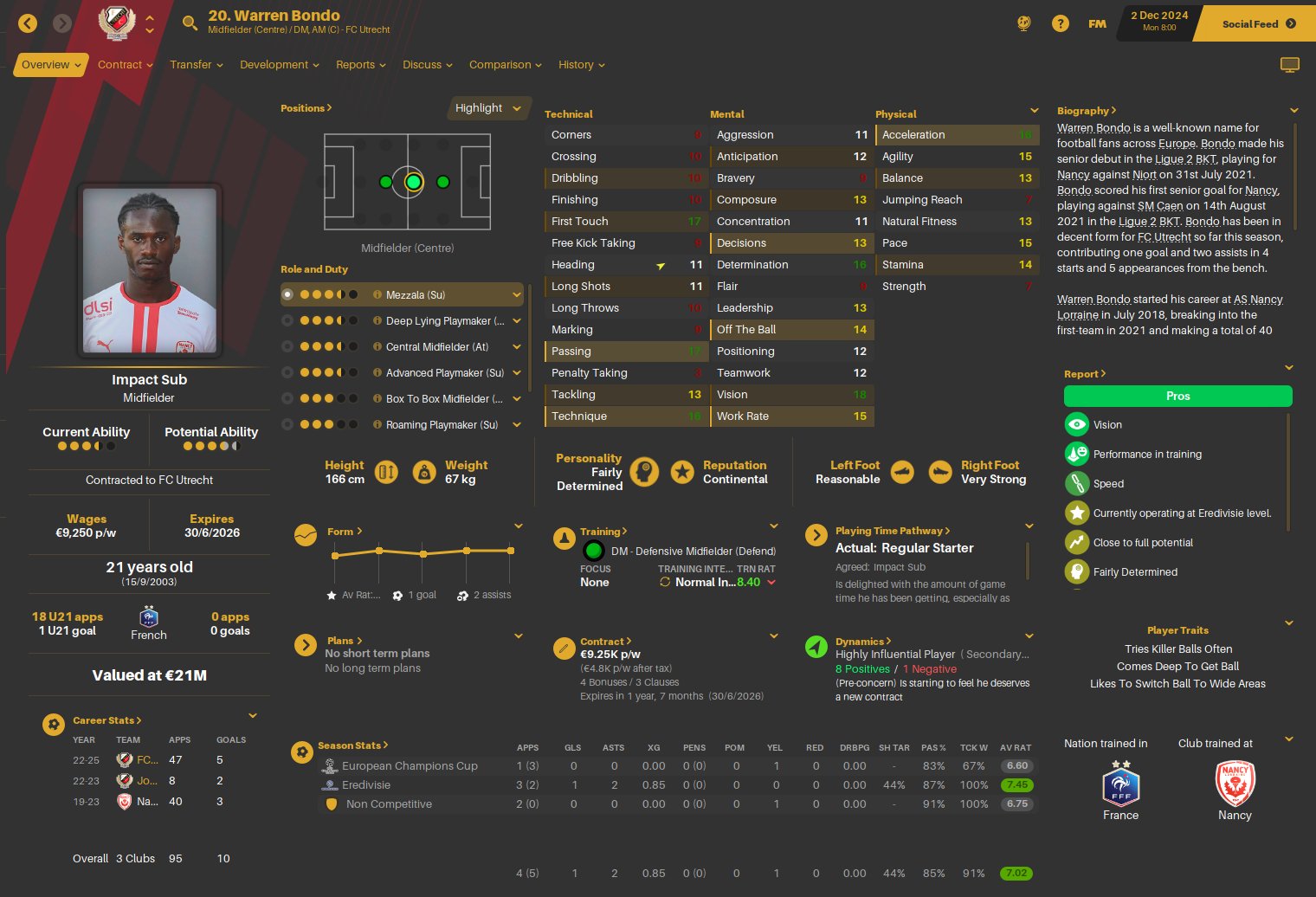 Warren Bondo profile in Football Manager 2026. Warren Bondo is a 16 years old professional footballer from France. His preferred foot is Right Only and the best role is Mezzala. In the first season of FM26, he is contracted to Nancy until 30-Jun-2022 earning £467 per week and has a market value of 32K. You can help the player reach that full FM26 potential with proper training.