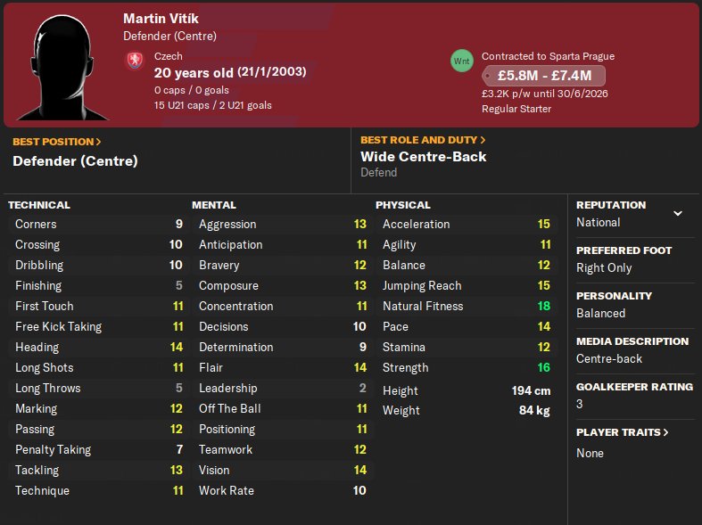 Martin Vitík profile in Football Manager 2024. Martin Vitík is a 20 years old professional footballer from Czech Republic. His preferred foot is Right Only and his best role is No-Nonsense Centre-Back. In the first season of FM24, he is contracted to Sparta Prague until 30-Jun-2026 earning £3K per week and has a market value of 6M. You can help him reach his full FM24 potential with proper training.