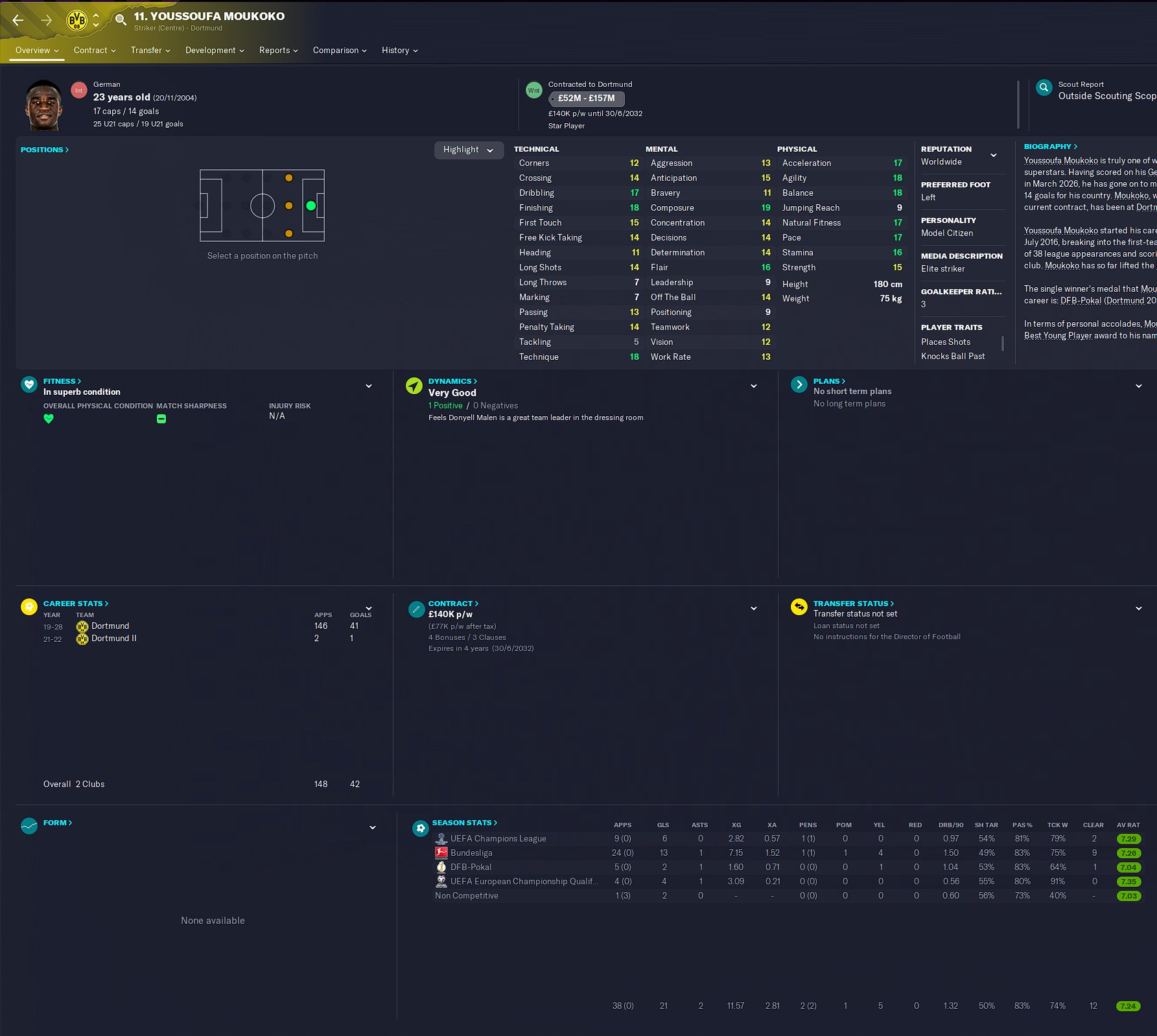 Youssoufa Moukoko profile in Football Manager 2026. Youssoufa Moukoko is a 17 years old professional footballer from Germany. His preferred foot is Left and the best role is Advanced Forward. In the first season of FM26, he is contracted to Borussia Dortmund until 30-Jun-2026 earning £50K per week and has a market value of 29M. You can help the player reach that full FM26 potential with proper training.