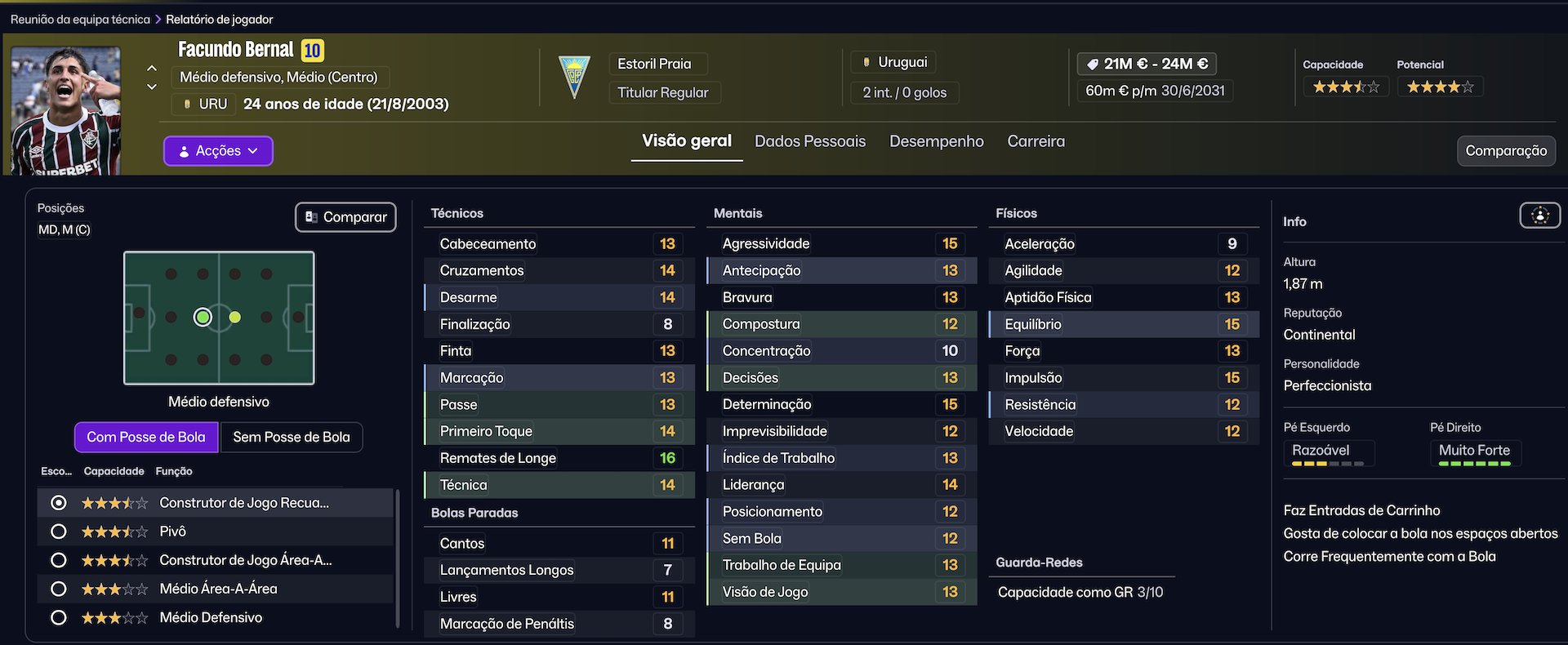 Facundo Bernal profile in Football Manager 2026. Facundo Bernal is a 21 years old professional footballer from Uruguay. His preferred foot is Right and the best IP role is Deep-Lying Playmaker while the best OOP role is Pressing Defensive Midfielder. In the first season of FM26, he is contracted to FLU until 31-Dec-2028 earning £9K per week and has a market value of 9M. You can help the player reach that full FM26 potential with proper training.