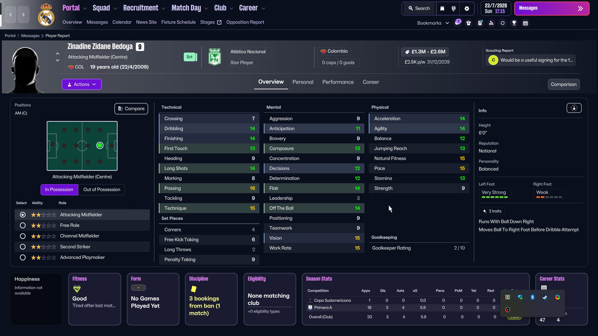 Zinadine Zidane Bedoya profile in Football Manager 2026. Zinadine Zidane Bedoya is a 16 years old professional footballer from Colombia. His preferred foot is Left and the best IP role is Advanced Playmaker while the best OOP role is Central Outlet Attacking Midfielder. In the first season of FM26, he is contracted to Atlético Nacional until 31-Dec-2027 earning £55 per week and has a market value of 692K. You can help the player reach that full FM26 potential with proper training.