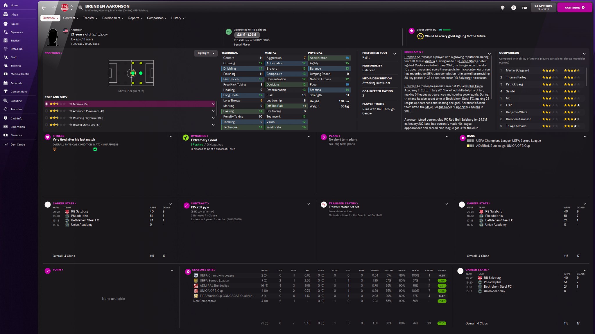 Brenden Aaronson profile in Football Manager 2024. Brenden Aaronson is a 20 years old professional footballer from U.S.A.. His preferred foot is Right and his best role is Winger. In the first season of FM24, he is contracted to FC RB Salzburg until 30-Jun-2025 earning £16K per week and has a market value of 10M. You can help him reach his full FM24 potential with proper training.