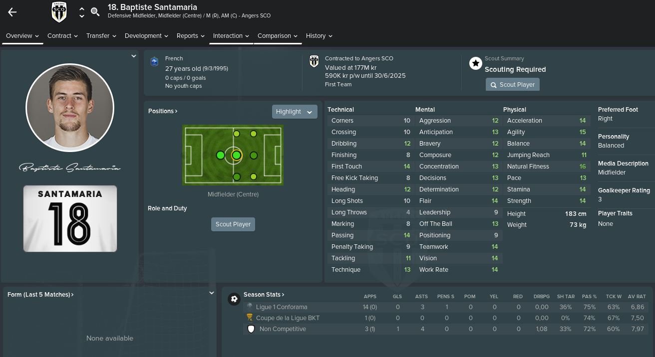 Baptiste Santamaria profile in Football Manager 2026. Baptiste Santamaria is a 23 years old professional footballer from France. His preferred foot is Right and the best role is Deep Lying Playmaker. In the first season of FM26, he is contracted to Angers SCO until 30-Jun-2022 earning £13K per week and has a market value of 4M. You can help the player reach that full FM26 potential with proper training.
