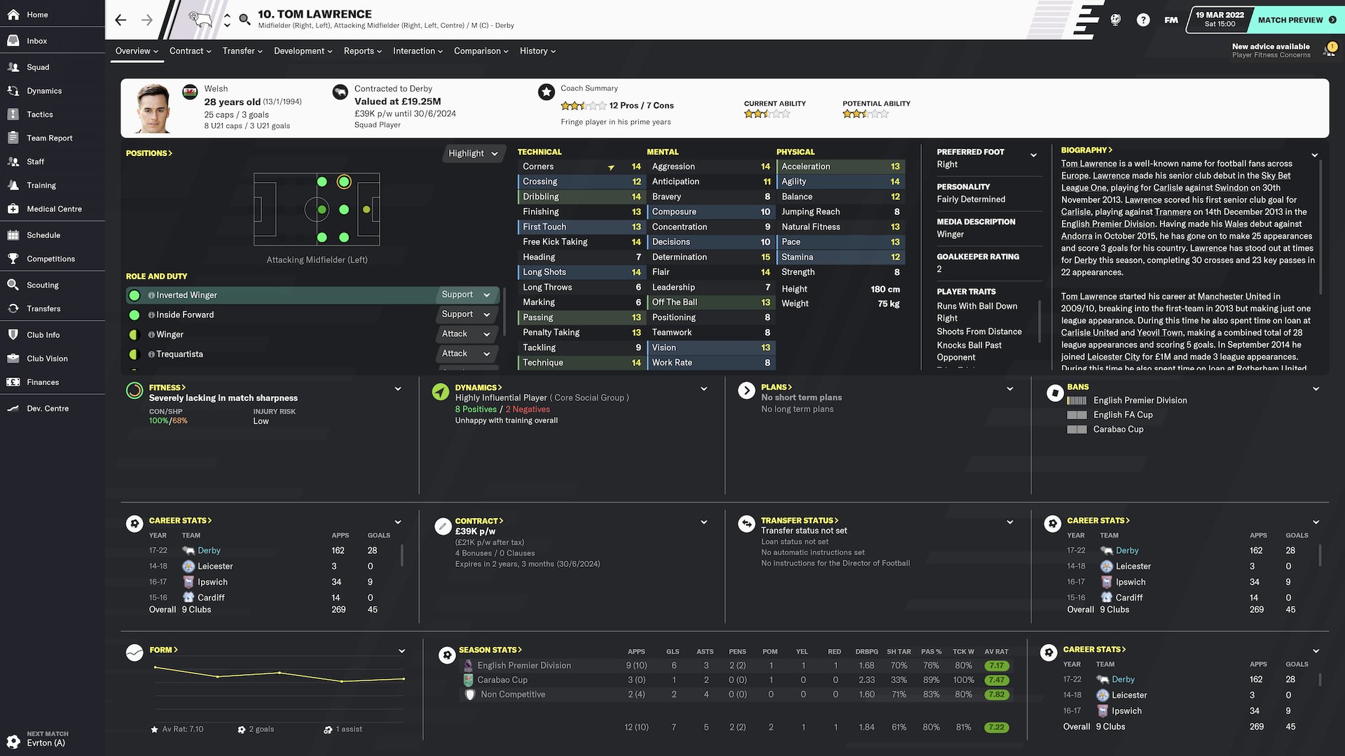 Tom Lawrence profile in Football Manager 2026. Tom Lawrence is a 25 years old professional footballer from Wales. His preferred foot is Right and the best role is Inside Forward. In the first season of FM26, he is contracted to Derby until 30-Jun-2022 earning £30K per week and has a market value of 4M. You can help the player reach that full FM26 potential with proper training.