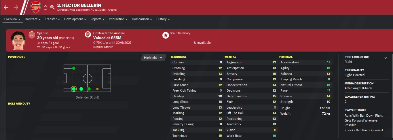 Hector Bellerin profile in Football Manager 2026. Hector Bellerin is a 24 years old professional footballer from Spain. His preferred foot is Right and the best role is Wing Back. In the first season of FM26, he is contracted to Arsenal until 30-Jun-2023 earning £110K per week and has a market value of 29M. You can help the player reach that full FM26 potential with proper training.