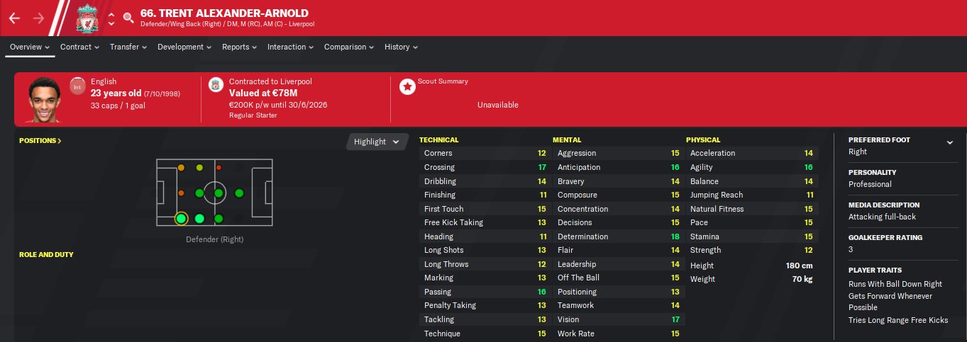 Trent Alexander-Arnold profile in Football Manager 2026. Trent Alexander-Arnold is a 20 years old professional footballer from England. His preferred foot is Right and the best role is Complete Wing Back. In the first season of FM26, he is contracted to Liverpool until 30-Jun-2024 earning £75K per week and has a market value of 52M. You can help the player reach that full FM26 potential with proper training.