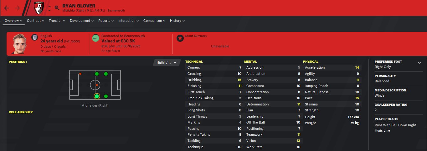 Ryan Glover profile in Football Manager 2020. Ryan Glover is a 18 years old professional footballer from England. His preferred foot is Right Only and the best IP role is Winger while the best OOP role is . In the first season of FM20, he is contracted to Bournemouth until 30-Jun-2020 earning £700 per week and has a market value of 91K. You can help the player reach that full FM20 potential with proper training.