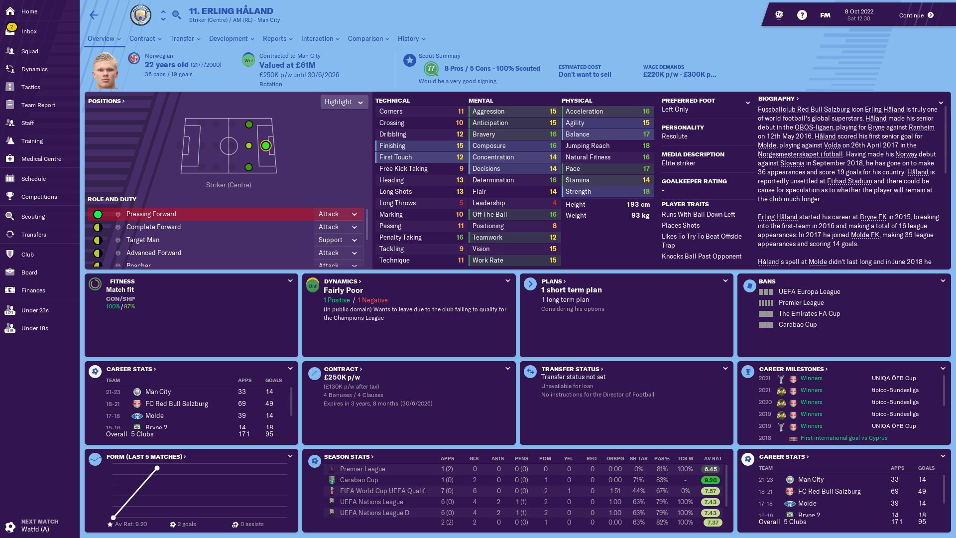 Erling Haland profile in Football Manager 2026. Erling Haland is a 17 years old professional footballer from Norway. His preferred foot is Left Only and the best role is Target Man. In the first season of FM26, he is contracted to FC RB Salzburg until 30-Jun-2023 earning £18K per week and has a market value of 18M. You can help the player reach that full FM26 potential with proper training.