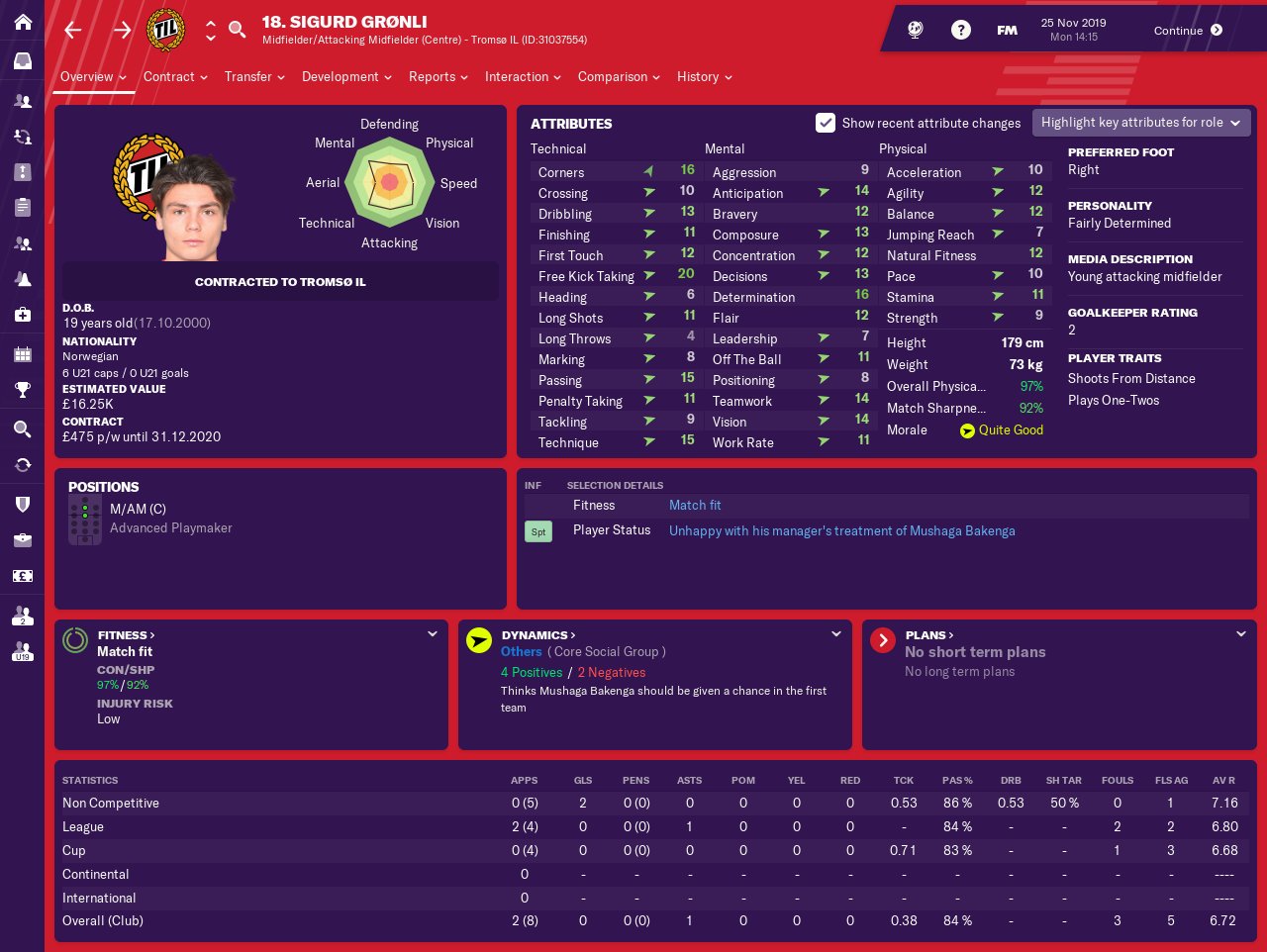 Sigurd Gronli profile in Football Manager 2019. Sigurd Gronli is a 17 years old professional footballer from Norway. His preferred foot is Right and his best role is Deep Lying Playmaker. In the first season of FM19, he is contracted to Tromso until 31-Dec-2020 earning £468 per week and has a market value of 6K. You can help him reach his full FM19 potential with proper training.