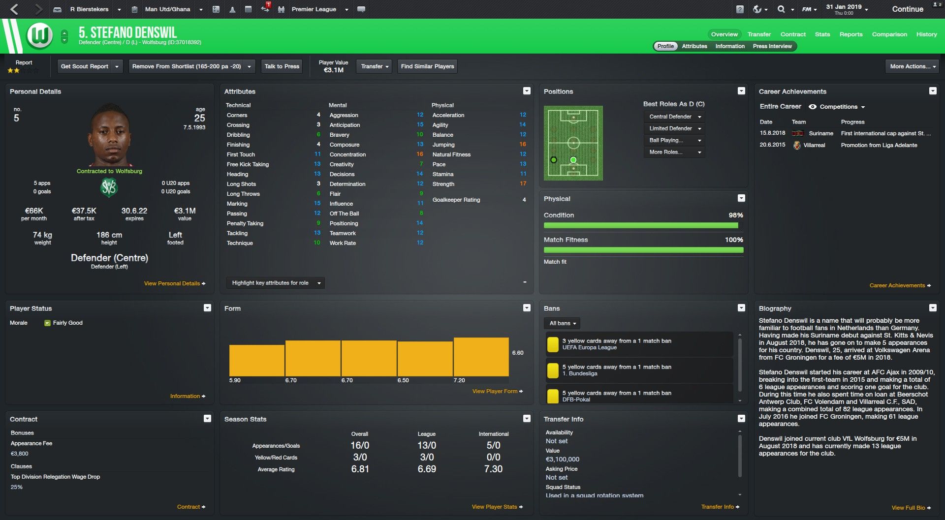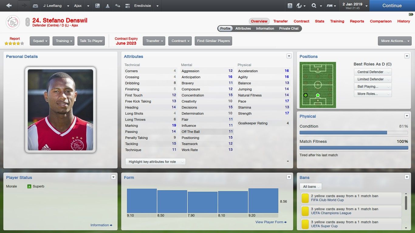 Stefano Denswil profile in Football Manager 2024. Stefano Denswil is a 19 years old professional footballer from Netherlands. His preferred foot is Left and his best role is . In the first season of FM24, he is contracted to Ajax until 30-Jun-2015 earning £2K per week and has a market value of 50K. You can help him reach his full FM24 potential with proper training.