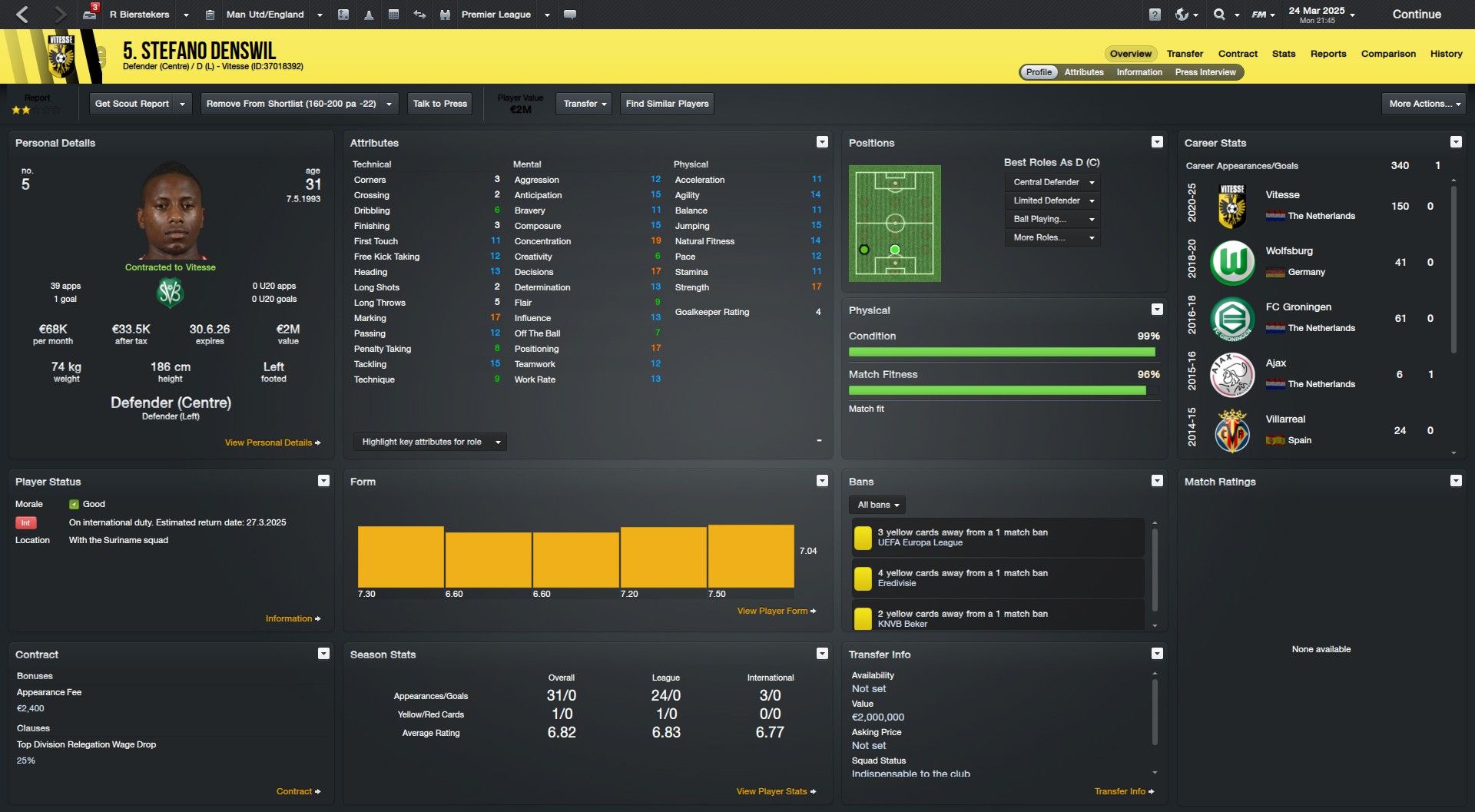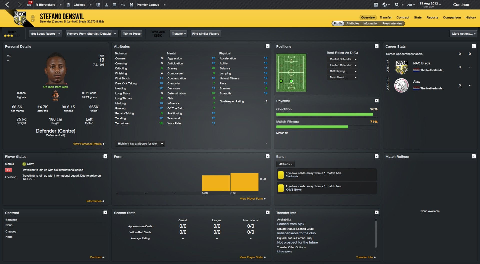 Denswil is one of the many talents at the Dutch club Ajax, in this version of FM he can be either one of the best defenders you can get, or hopelessly fail and will never be heard of again. Stefano is out on a loan at the start of the game so you’ll have to wait a bit longer before he will actually join.