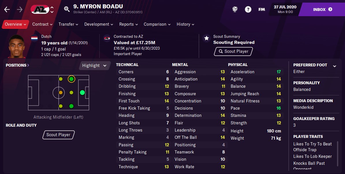 Myron Boadu profile in Football Manager 2026. Myron Boadu is a 19 years old professional footballer from Netherlands. His preferred foot is Either and the best role is Advanced Forward. In the first season of FM26, he is contracted to AZ until 30-Jun-2023 earning £17K per week and has a market value of 17M. You can help the player reach that full FM26 potential with proper training.