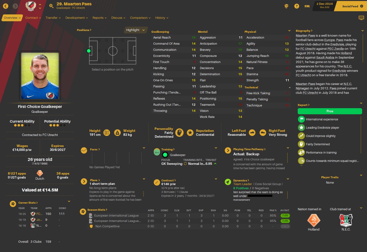 Maarten Paes profile in Football Manager 2024. Maarten Paes is a 22 years old professional footballer from Netherlands. His preferred foot is Right and his best role is Goalkeeper. In the first season of FM24, he is contracted to FC Utrecht until 30-Jun-2023 earning £3K per week and has a market value of 2M. You can help him reach his full FM24 potential with proper training.