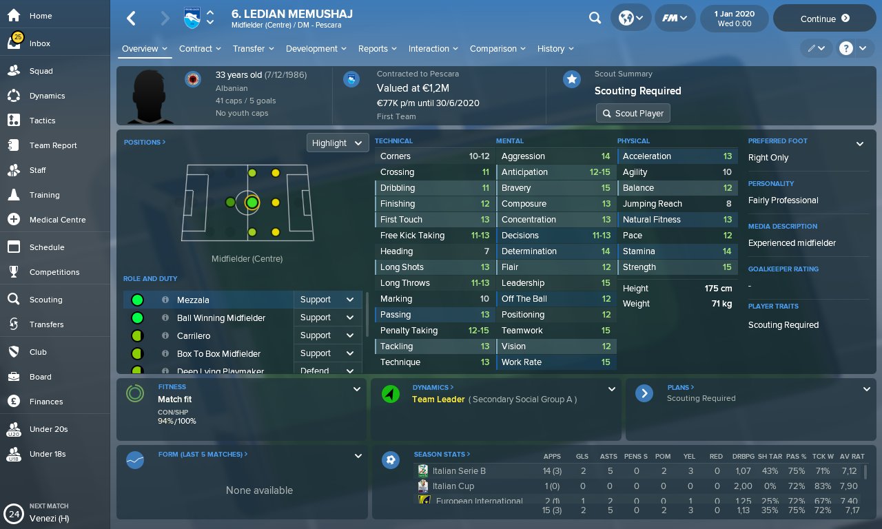 Ledian Memushaj profile in Football Manager 2020. Ledian Memushaj is a 30 years old professional footballer from Albania. His preferred foot is Right Only and the best role is . In the first season of FM20, he is contracted to Pescara until 30-Jun-2018 earning £6K per week and has a market value of 2M.