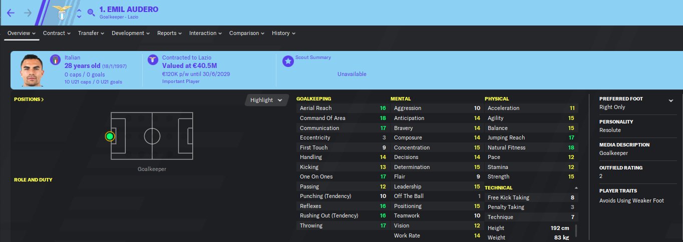 Emil Audero profile in Football Manager 2026. Emil Audero is a 22 years old professional footballer from Italy. His preferred foot is Right Only and the best role is Goalkeeper. In the first season of FM26, he is contracted to Sampdoria until 30-Jun-2023 earning £25K per week and has a market value of 6M. You can help the player reach that full FM26 potential with proper training.