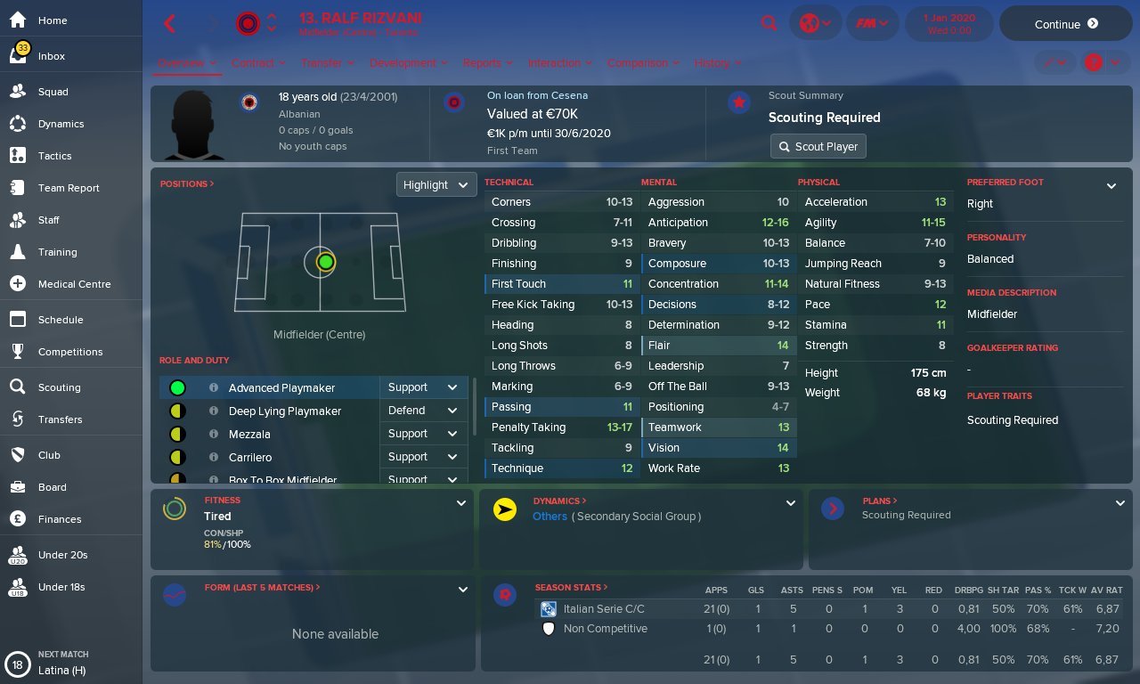 Ralf Rizvani profile in Football Manager 2018. Ralf Rizvani is a 16 years old professional footballer from Albania. His preferred foot is Right and the best IP role is Advanced Playmaker while the best OOP role is . In the first season of FM18, he is contracted to Cesena until 30-Jun-2020 earning £196 per week and has a market value of 20K. You can help the player reach that full FM18 potential with proper training.