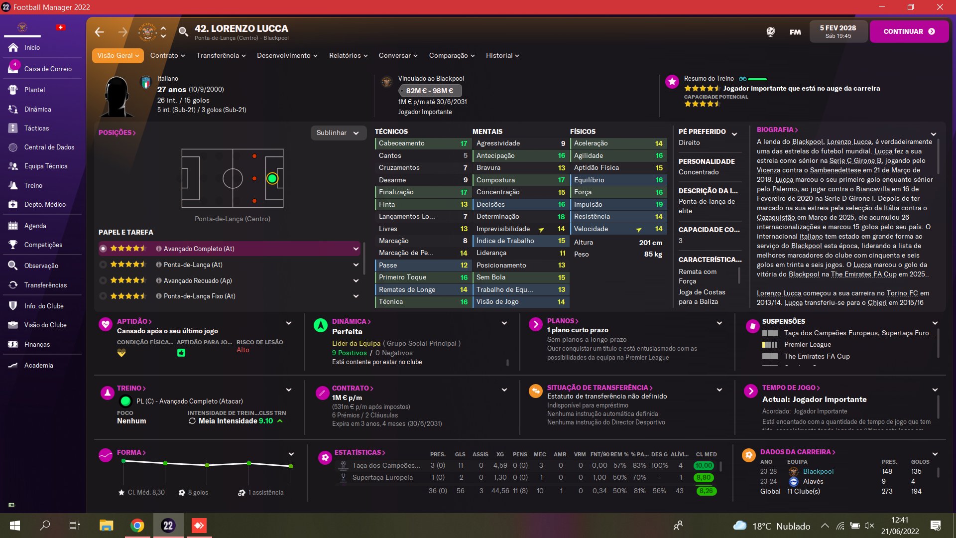 - upload FM22 screenshots of him that showcase his attributes and historic performances.