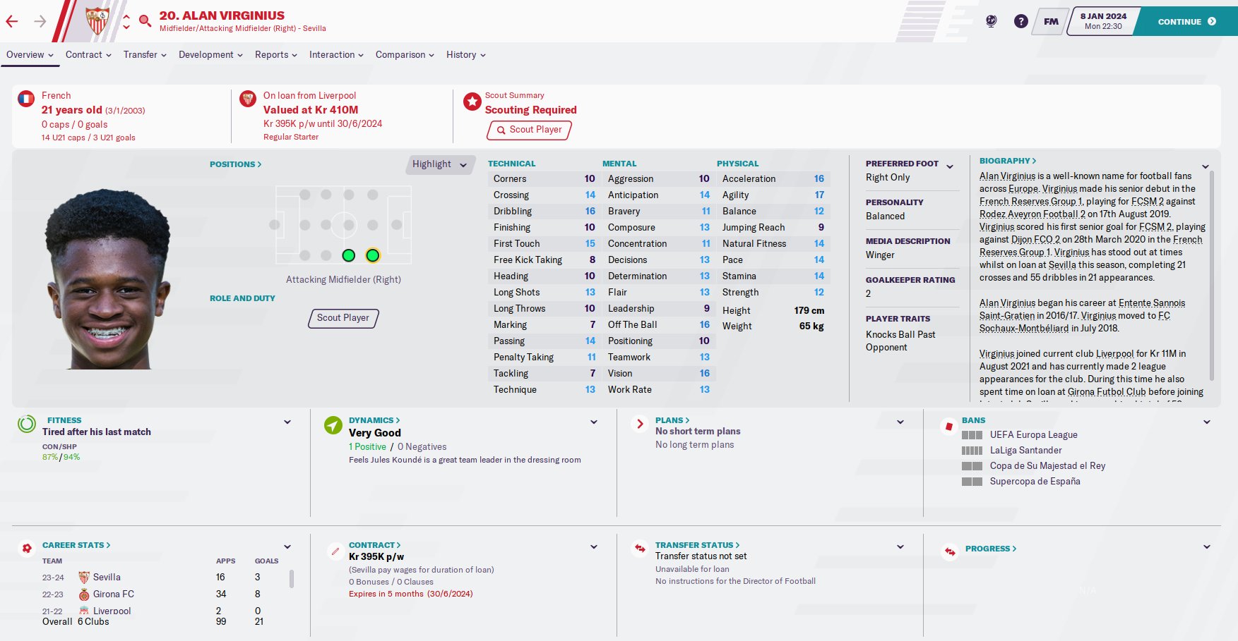 Alan Virginius profile in Football Manager 2026. Alan Virginius is a 16 years old professional footballer from France. His preferred foot is Right Only and the best role is Winger. In the first season of FM26, he is contracted to FCSM until 30-Jun-2022 earning £50 per week and has a market value of 50K. You can help the player reach that full FM26 potential with proper training.