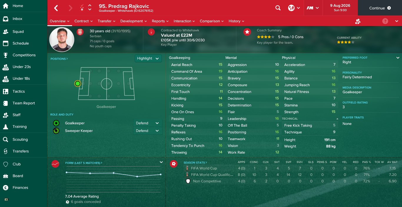 Predrag Rajkovic profile in Football Manager 2026. Predrag Rajkovic is a 20 years old professional footballer from Serbia. His preferred foot is Right and the best role is . In the first season of FM26, he is contracted to Maccabi Tel-Aviv until 31-May-2020 earning £10K per week and has a market value of 986K. You can help the player reach that full FM26 potential with proper training.