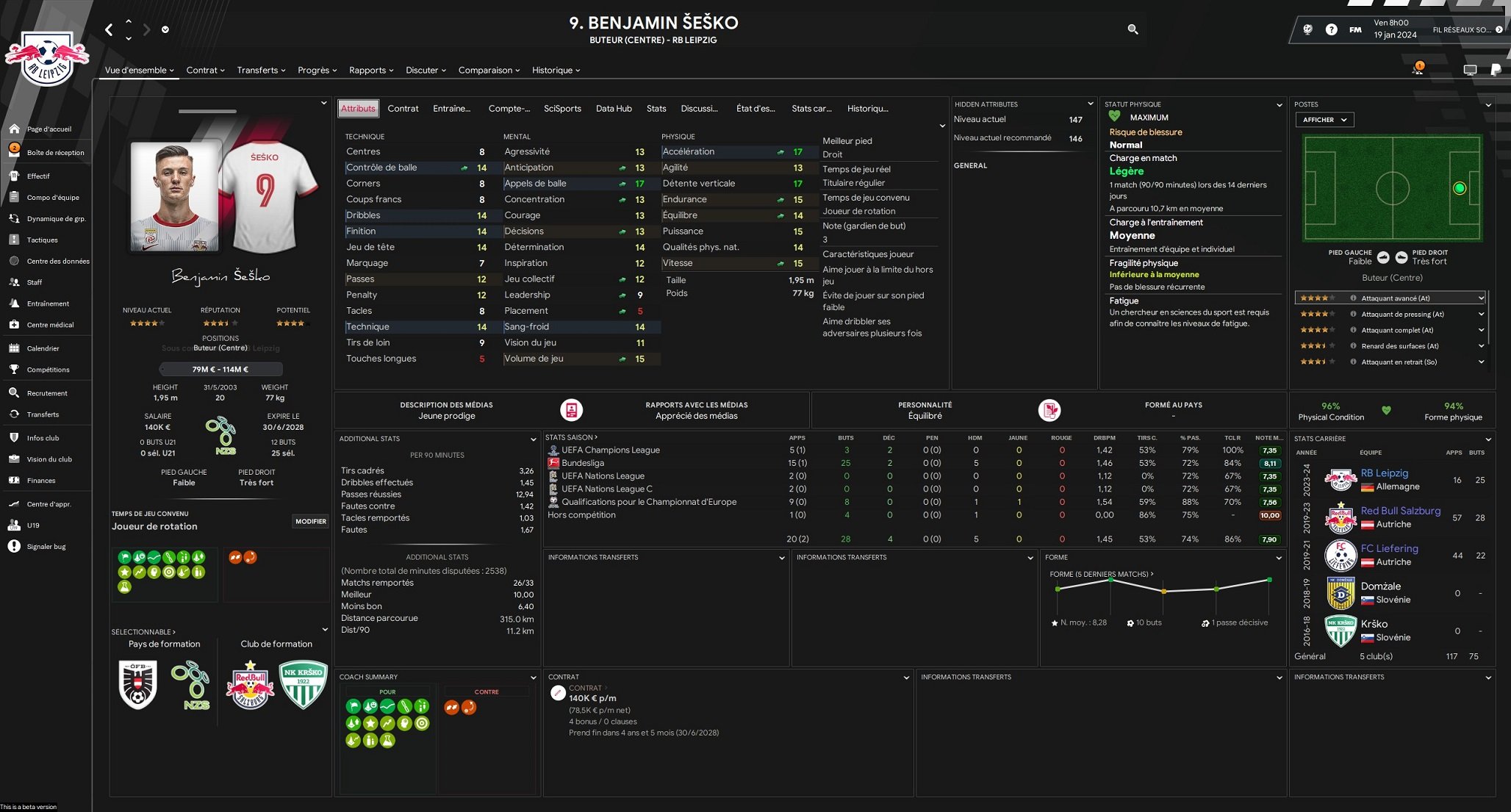 Benjamin Šeško profile in Football Manager 2024. Benjamin Šeško is a 19 years old professional footballer from Slovenia. His preferred foot is Right and his best role is Poacher. In the first season of FM24, he is contracted to FC RB Salzburg until 30-Jun-2026 earning £10K per week and has a market value of 21M. You can help him reach his full FM24 potential with proper training.