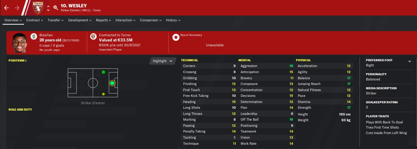 Wesley profile in Football Manager 2026. Wesley is a 22 years old professional footballer from Brazil. His preferred foot is Right and the best role is Target Man. In the first season of FM26, he is contracted to Aston Villa until 30-Jun-2024 earning £50K per week and has a market value of 14M. You can help the player reach that full FM26 potential with proper training.