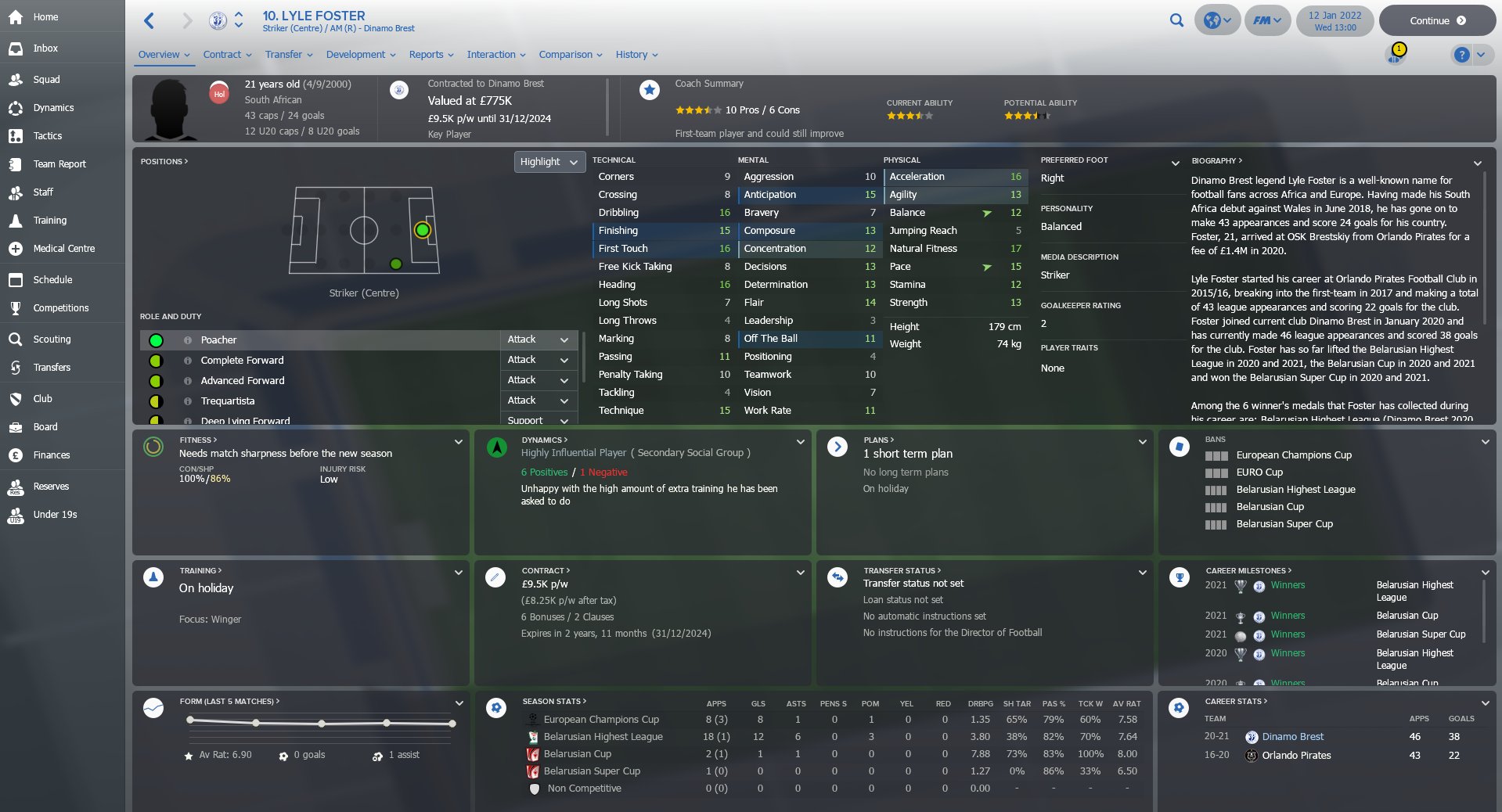 Lyle Foster profile in Football Manager 2026. Lyle Foster is a 16 years old professional footballer from South Africa. His preferred foot is Right and the best role is Poacher. In the first season of FM26, he is contracted to Orlando Pirates until 30-Jun-2020 earning £25 per week and has a market value of 50K. You can help the player reach that full FM26 potential with proper training.