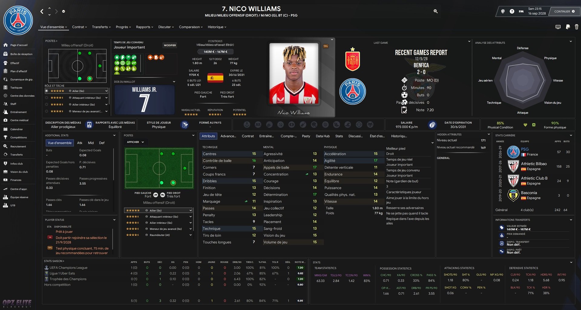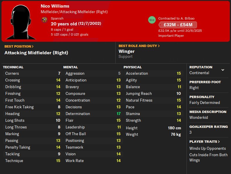 Nico Williams profile in Football Manager 2024. Nico Williams is a 20 years old professional footballer from Spain. His preferred foot is Either and his best role is Winger. In the first season of FM24, he is contracted to A. Bilbao until 30-Jun-2027 earning £34K per week and has a market value of 43M. You can help him reach his full FM24 potential with proper training.