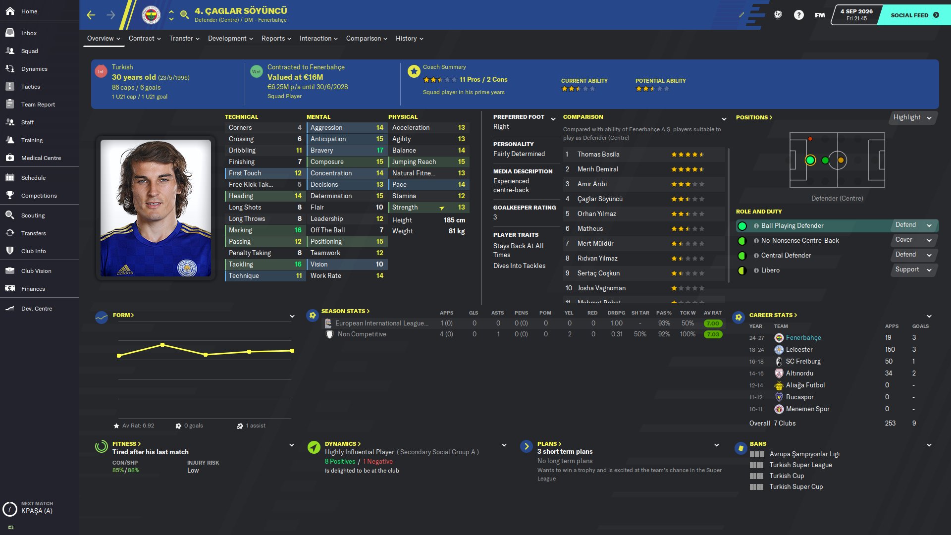 Caglar Soyuncu profile in Football Manager 2024. Caglar Soyuncu is a 23 years old professional footballer from Turkey. His preferred foot is Right and his best role is No-Nonsense Centre-Back. In the first season of FM24, he is contracted to Leicester until 30-Jun-2023 earning £45K per week and has a market value of 30M. You can help him reach his full FM24 potential with proper training.
