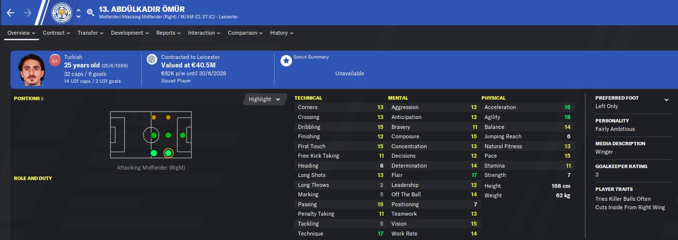 Abdulkadir Omur profile in Football Manager 2024. Abdulkadir Omur is a 20 years old professional footballer from Turkey. His preferred foot is Left Only and his best role is Inside Forward. In the first season of FM24, he is contracted to Trabzonspor until 30-Jun-2022 earning £8K per week and has a market value of 7M. You can help him reach his full FM24 potential with proper training.