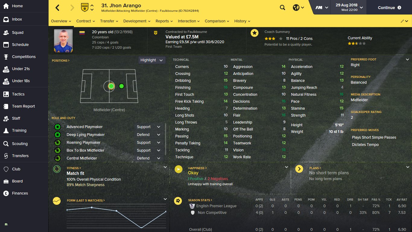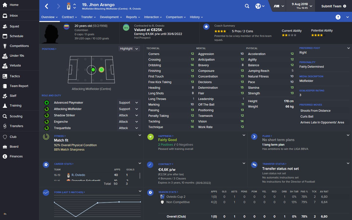 In the first season of FM16, he is contracted to Deportivo Estudiantil until 31-Dec-2016 earning £14 per week and has a market value of 20K. You can help the player reach that full FM16 potential with proper training.