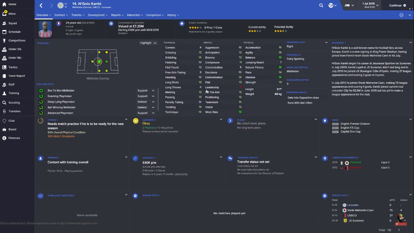 N'Golo Kante profile in Football Manager 2026. N'Golo Kante is a 24 years old professional footballer from France. His preferred foot is Right Only and the best role is . In the first season of FM26, he is contracted to Leicester until 30-Jun-2019 earning £40K per week and has a market value of 24M. You can help the player reach that full FM26 potential with proper training.