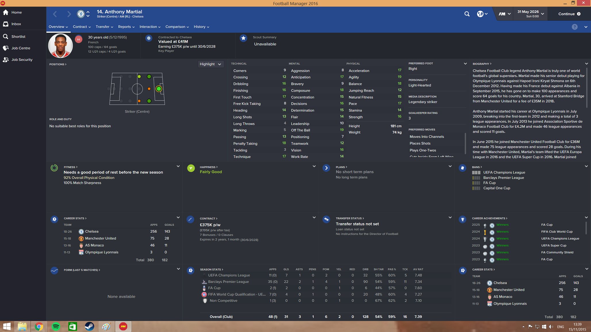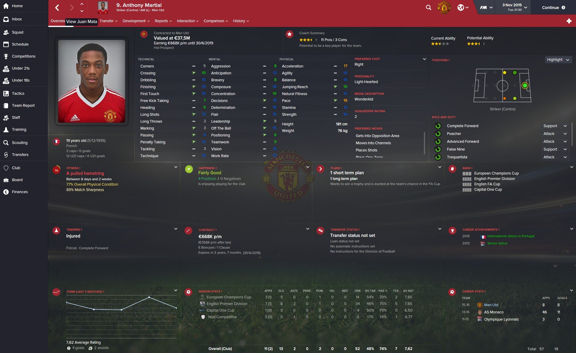 Background:Started Man Utd save (that's the team I support), and 3 seasons in, if there is one player I wouldn't sell for any price whatsoever, it's Anthony Martial. I'm away from my home laptop right now, so I'm having to rely on my memory for some of these things.