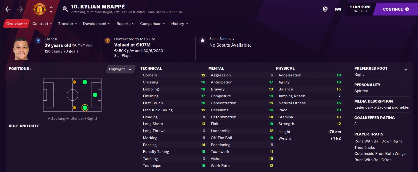 - upload FM21 screenshots of him that showcase his attributes and historic performances.