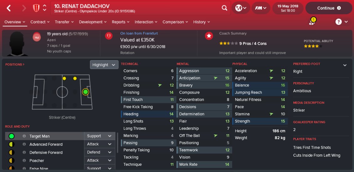 Renat Dadachov profile in Football Manager 2021. Renat Dadachov is a 18 years old professional footballer from Azerbaijan. His preferred foot is Right and the best role is Target Man. In the first season of FM21, he is contracted to Frankfurt until 30-Jun-2020 earning £2K per week and has a market value of 213K. You can help the player reach that full FM21 potential with proper training.