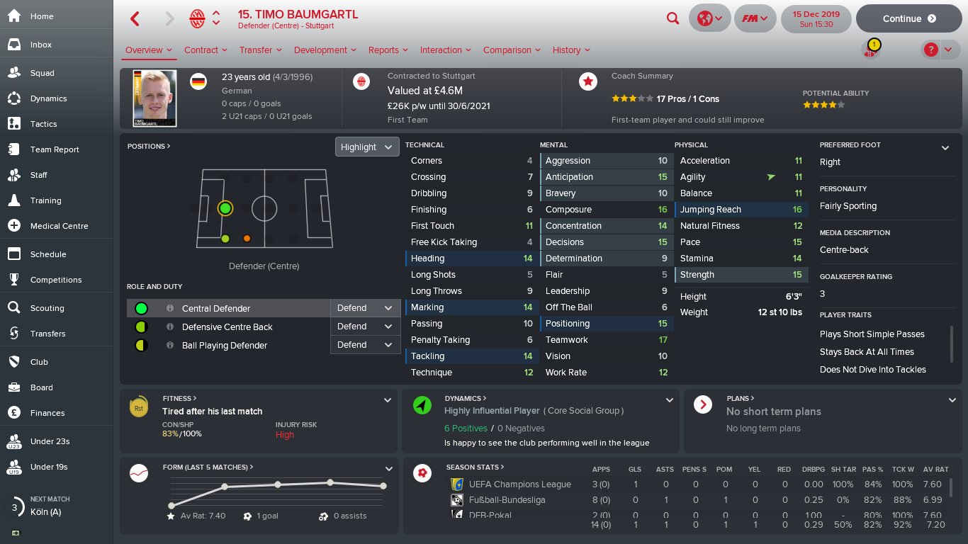 Timo Baumgartl profile in Football Manager 2026. Timo Baumgartl is a 21 years old professional footballer from Germany. His preferred foot is Right and the best role is . In the first season of FM26, he is contracted to Stuttgart until 30-Jun-2022 earning £26K per week and has a market value of 3M. You can help the player reach that full FM26 potential with proper training.