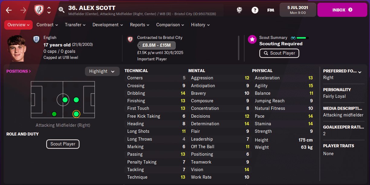 Alex Scott profile in Football Manager 2026. Alex Scott is a 17 years old professional footballer from England. His preferred foot is Right and the best role is Inside Forward. In the first season of FM26, he is contracted to Bristol City until 30-Jun-2025 earning £2K per week and has a market value of 10M. You can help the player reach that full FM26 potential with proper training.