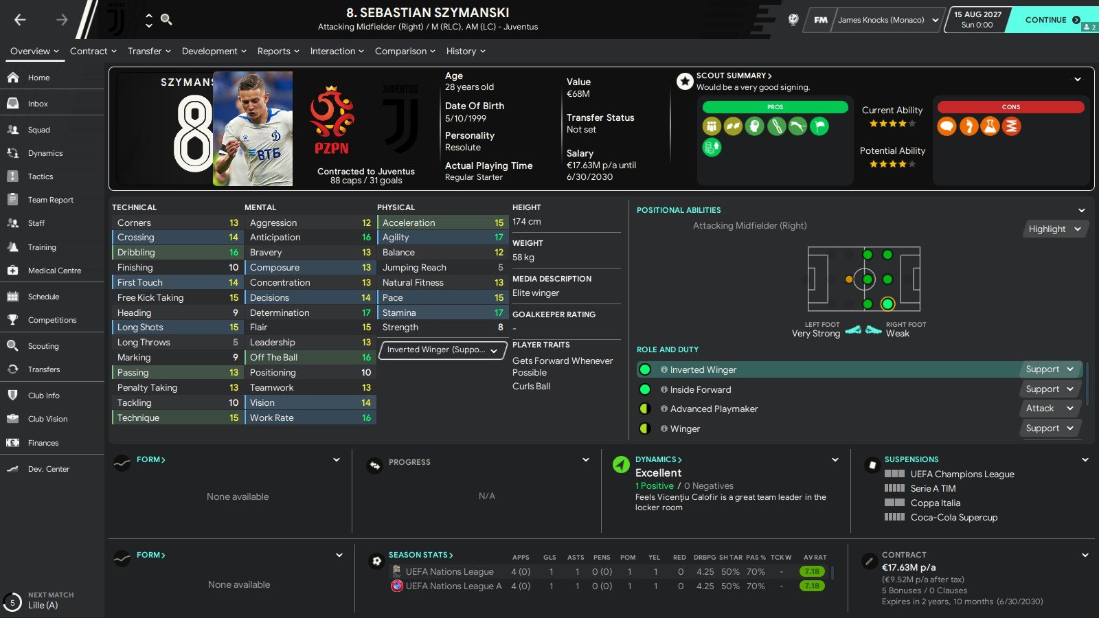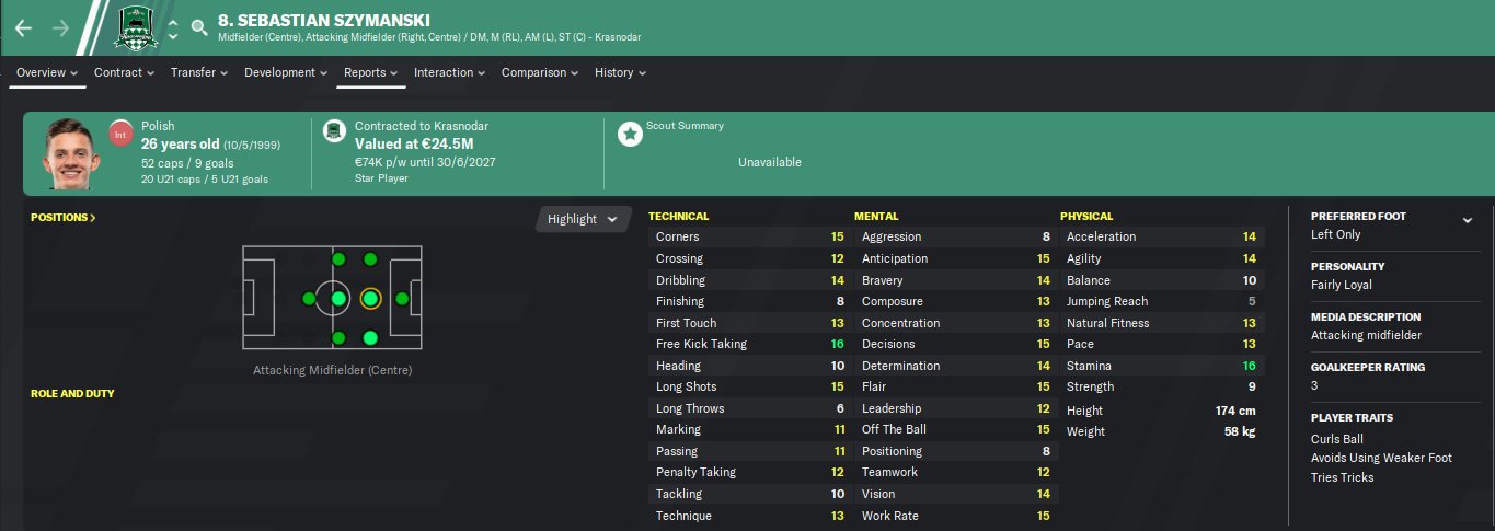 Sebastian Szymanski profile in Football Manager 2024. Sebastian Szymanski is a 20 years old professional footballer from Poland. His preferred foot is Left Only and his best role is Winger. In the first season of FM24, he is contracted to Dinamo Moscow until 31-May-2024 earning £18K per week and has a market value of 2M. You can help him reach his full FM24 potential with proper training.