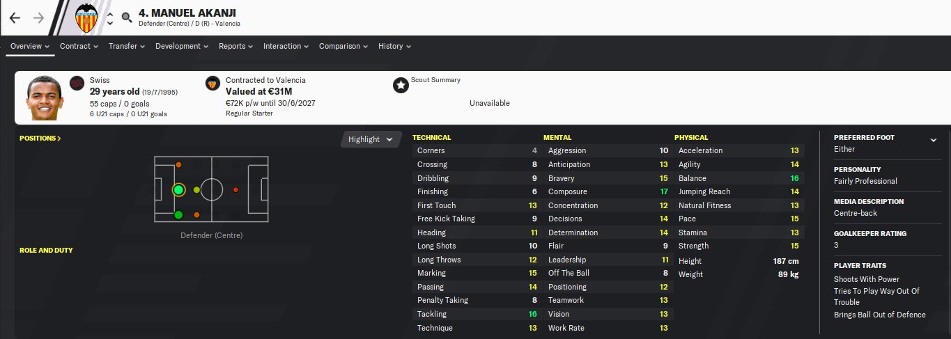 Manuel Akanji profile in Football Manager 2026. Manuel Akanji is a 23 years old professional footballer from Switzerland. His preferred foot is Either and the best role is Central Defender. In the first season of FM26, he is contracted to Borussia Dortmund until 30-Jun-2022 earning £50K per week and has a market value of 16M. You can help the player reach that full FM26 potential with proper training.