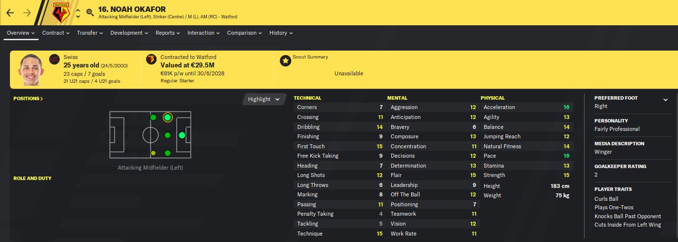 Noah Okafor profile in Football Manager 2026. Noah Okafor is a 19 years old professional footballer from Switzerland. His preferred foot is Right and the best role is Inside Forward. In the first season of FM26, he is contracted to FC RB Salzburg until 31-May-2020 earning £13K per week and has a market value of 2M. You can help the player reach that full FM26 potential with proper training.
