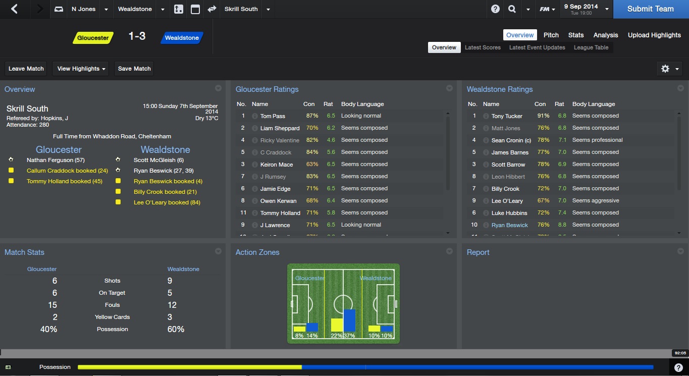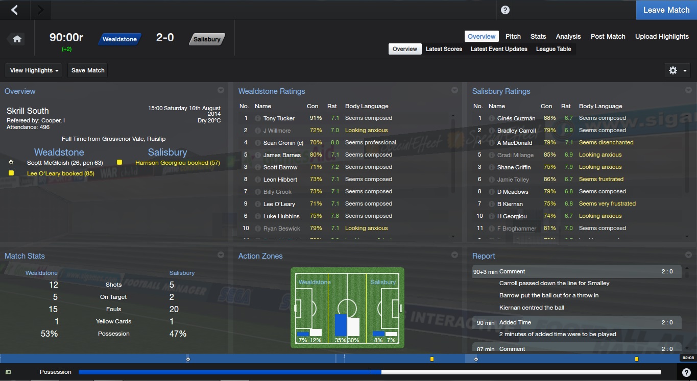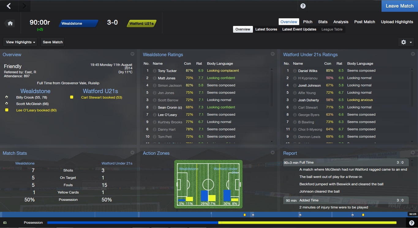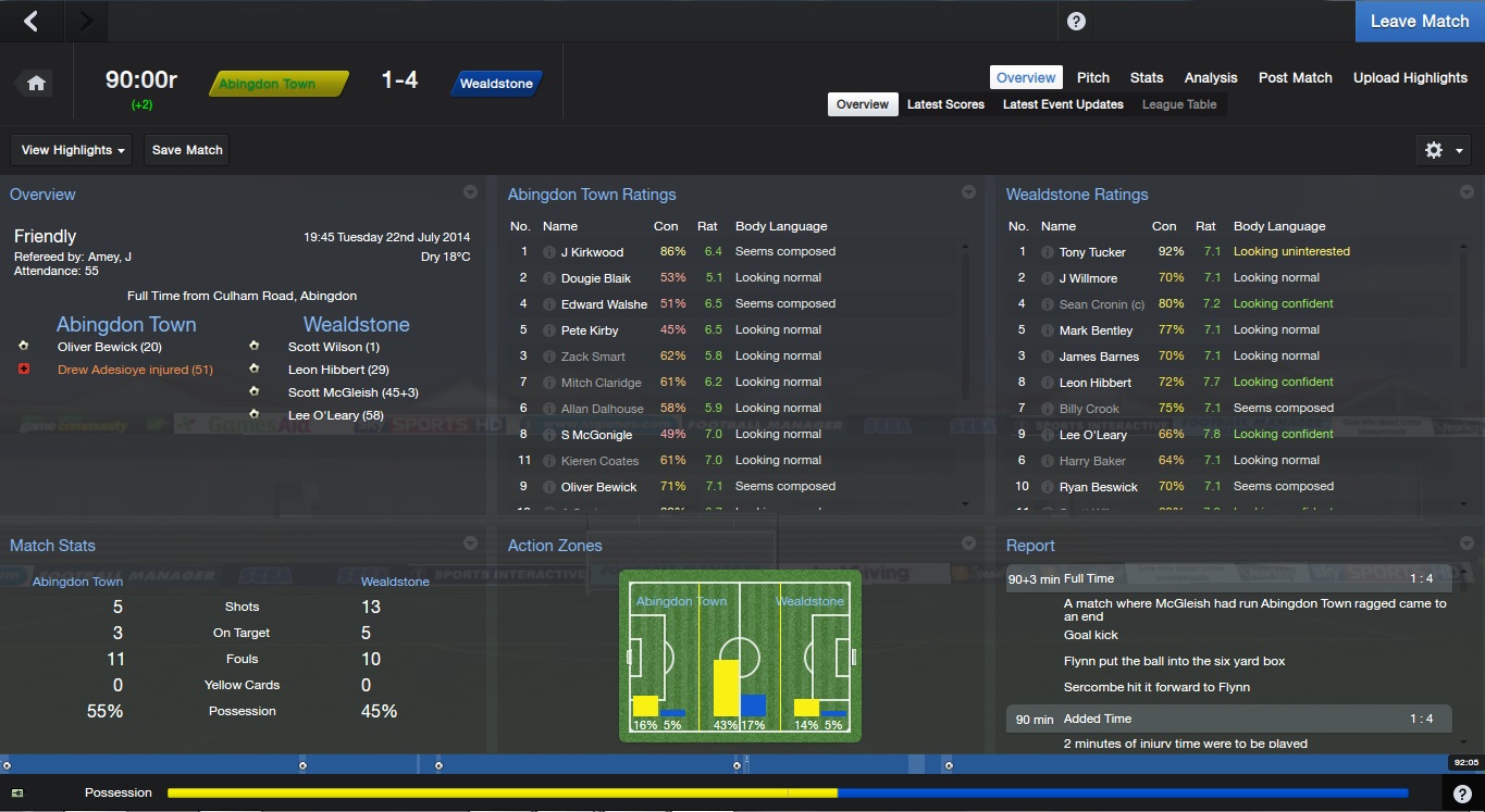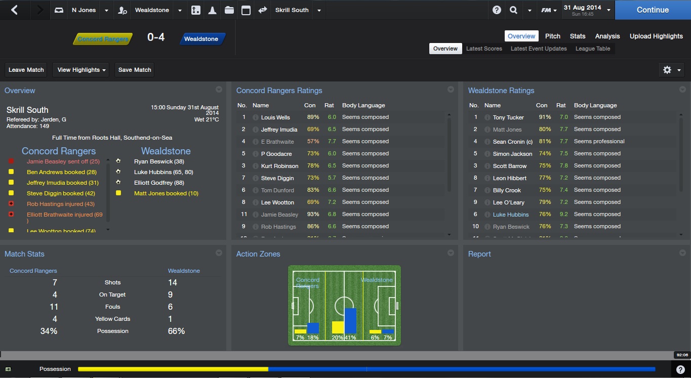 Our last game was against Concord Rangers who from kick off, looked like an equal opponent. But after the sending off of Jamie Beasley in the 25th minute, Concords day went from bad to worse. My possession based tactic mean that Concord didn't have a chance with only 34% possession and 4 shots on target, at home. Inform winger Beswick scored first with a tap in from a Hubbins cross. Hubbins then scored in the 65th minute with a tidy finish, then Hubbins doubled his lead on the 80 minute mark. Impact substitute Godfrey completed the route with a simple finish inside the area in the 88th minute. Although we won that game comfortably there were a few scares at the start of the game where set pieces were poorly defended, I will be training this in weeks to come.