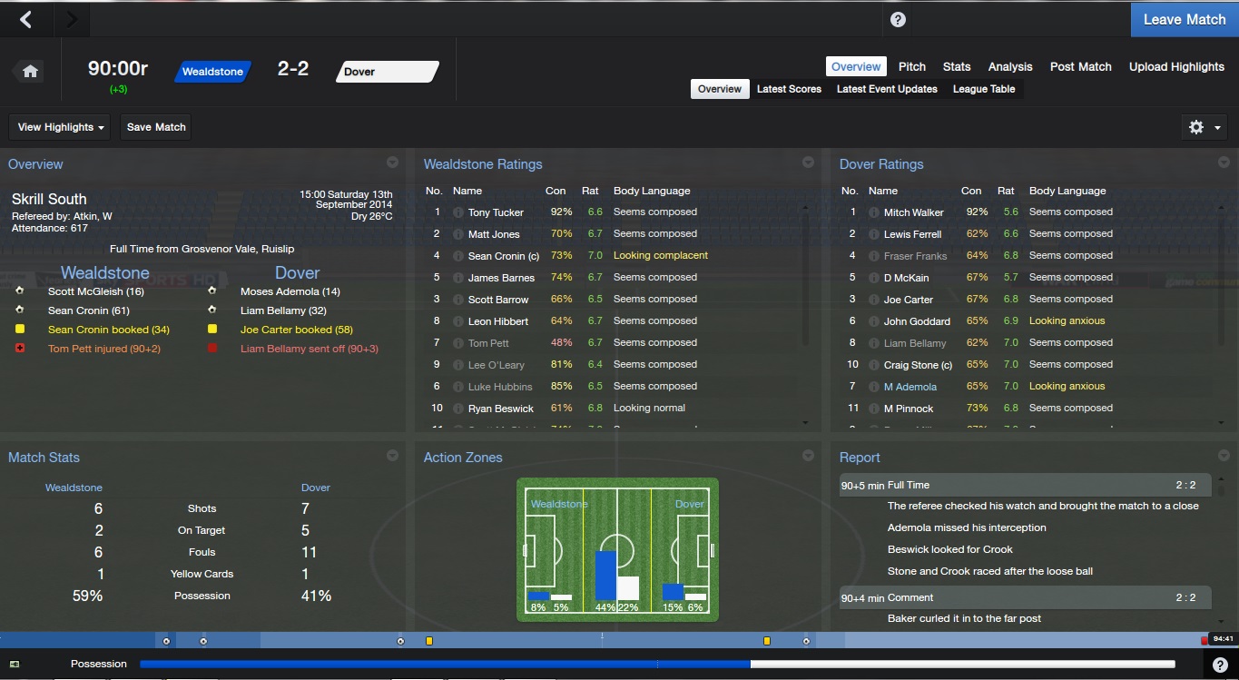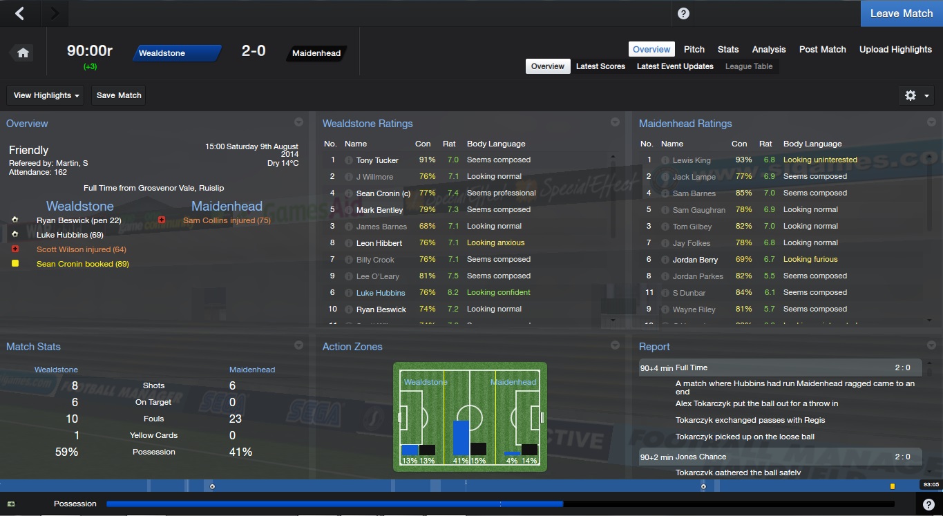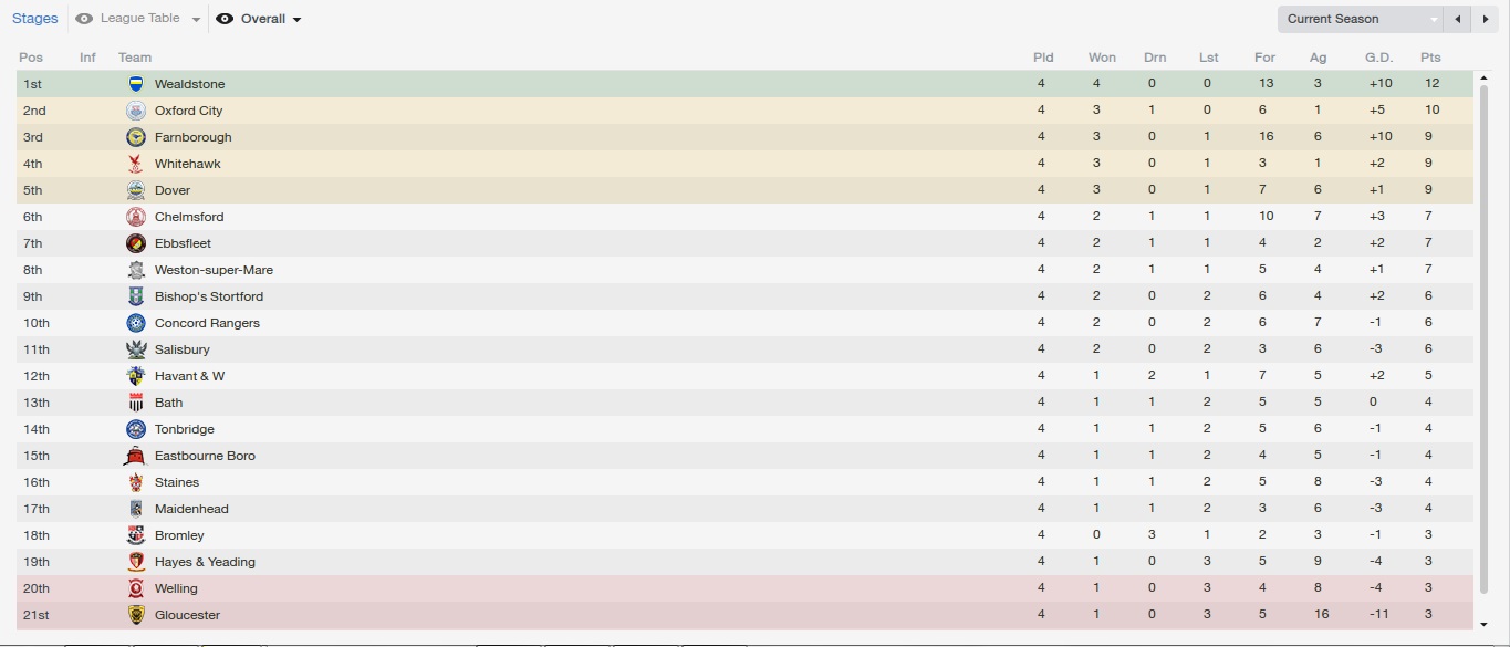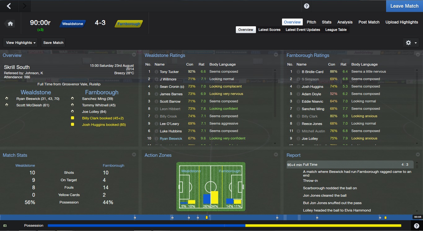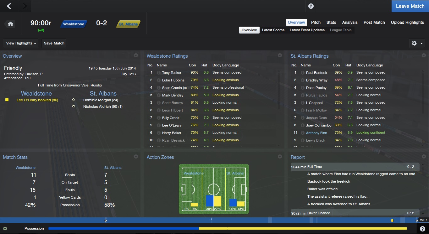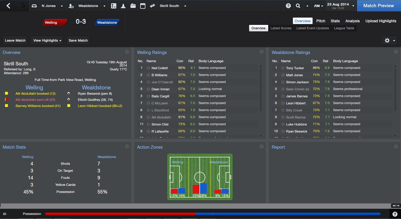 Our last game was against Concord Rangers who from kick off, looked like an equal opponent. But after the sending off of Jamie Beasley in the 25th minute, Concords day went from bad to worse. My possession based tactic mean that Concord didn't have a chance with only 34% possession and 4 shots on target, at home. Inform winger Beswick scored first with a tap in from a Hubbins cross. Hubbins then scored in the 65th minute with a tidy finish, then Hubbins doubled his lead on the 80 minute mark. Impact substitute Godfrey completed the route with a simple finish inside the area in the 88th minute. Although we won that game comfortably there were a few scares at the start of the game where set pieces were poorly defended, I will be training this in weeks to come.