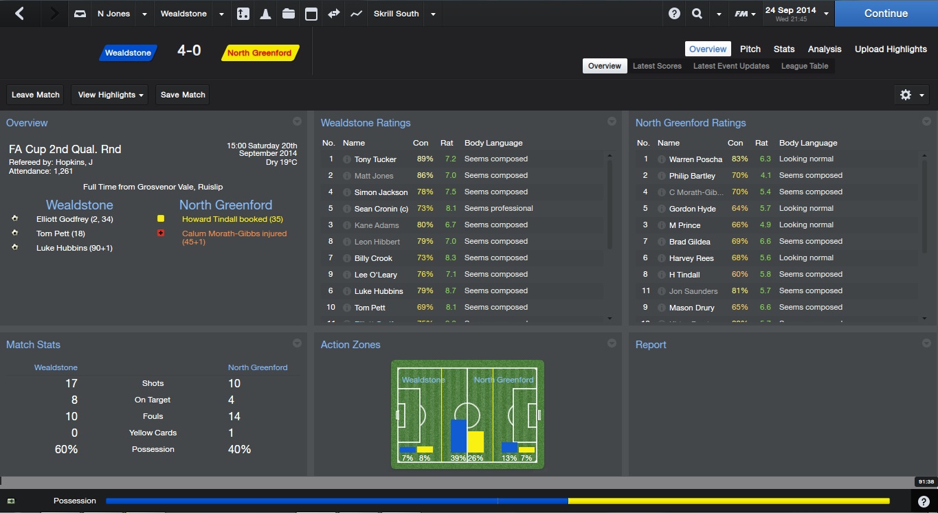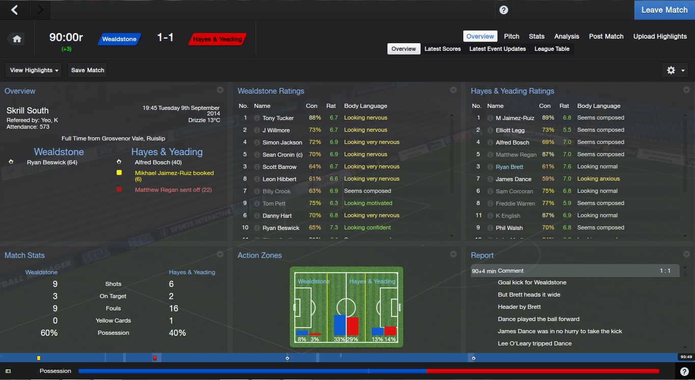 Our next game was only 2 days later forcing me to put out a fitter, but weaker side against 14th placed Hayes & Yeading. Regan was sent off in the 22nd minute on a foul on Godfrey going one on one. But H & Y were able to equalise, Bosch unmarked, received the ball from a set piece and smashed it home. But star-man Beswick managed to claw a goal back in the 64th minute, cutting in and driving in a near post shot just outside the box. The game ended 1-1, fitness was obviously affecting our performance forcing to play a weaker side. In conclusion a poor game, and one to forget about.