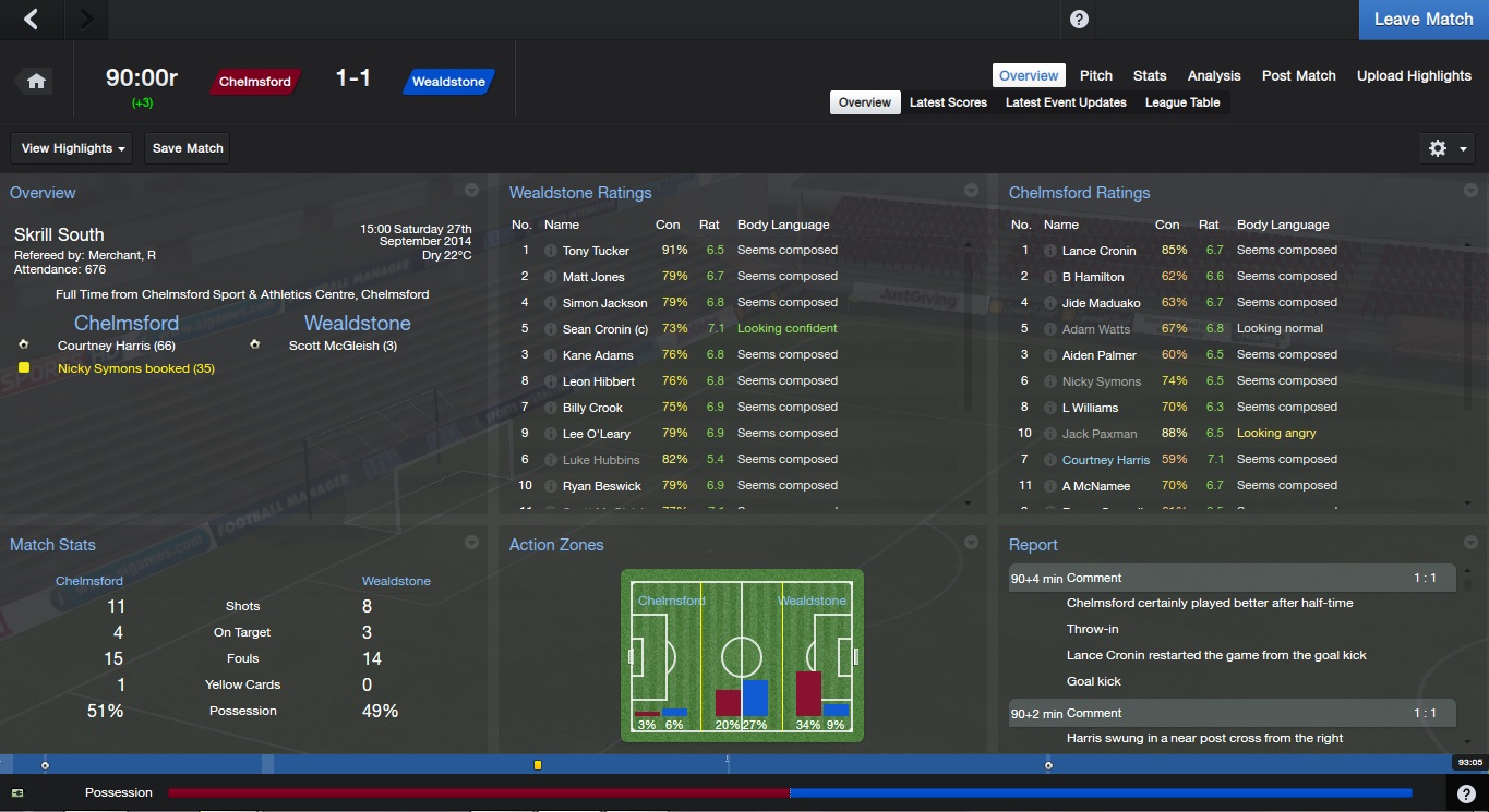 Our fifth game this month was against FA Cup opponents Chelmsford. Chelmsford found themselves 7th in the league losing only one game. We scored just 3 minutes after McGleish slotted in after a Adams deep free kick. Chelmsford equalised in the 66th minute with a Harris volley. I thought the result was fair considering CHelmsford were favorites.