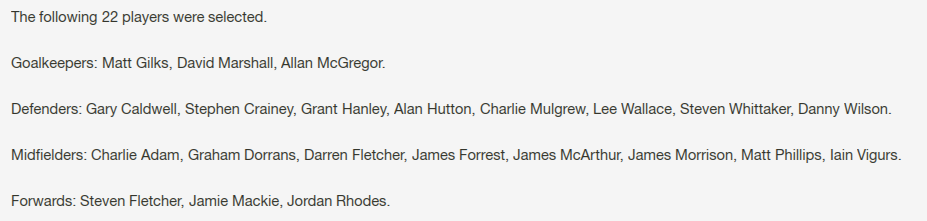 Notable absences due to injury: Leigh griffiths(Celtic), Ikechi Anya(Watford), Shaun Maloney(Wigan),Robert Snodgrass(Newcastle)