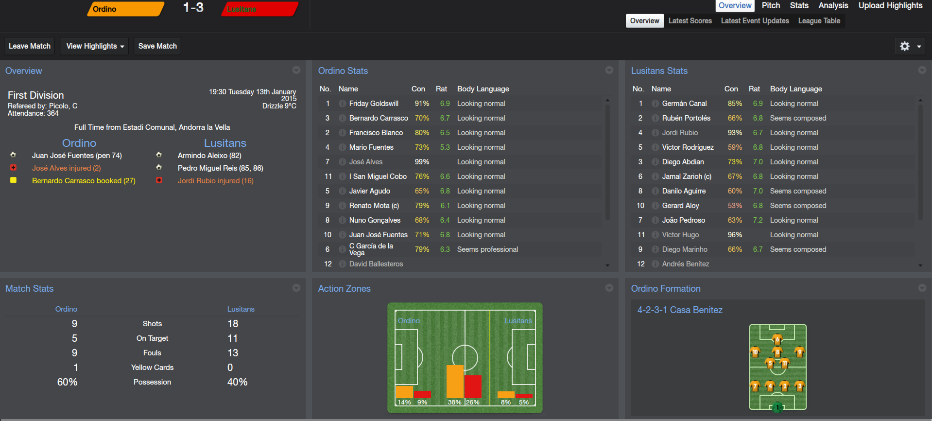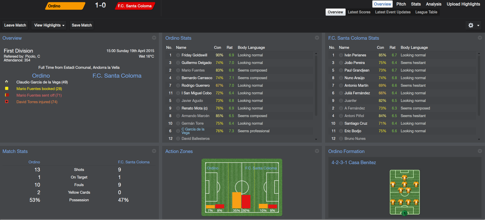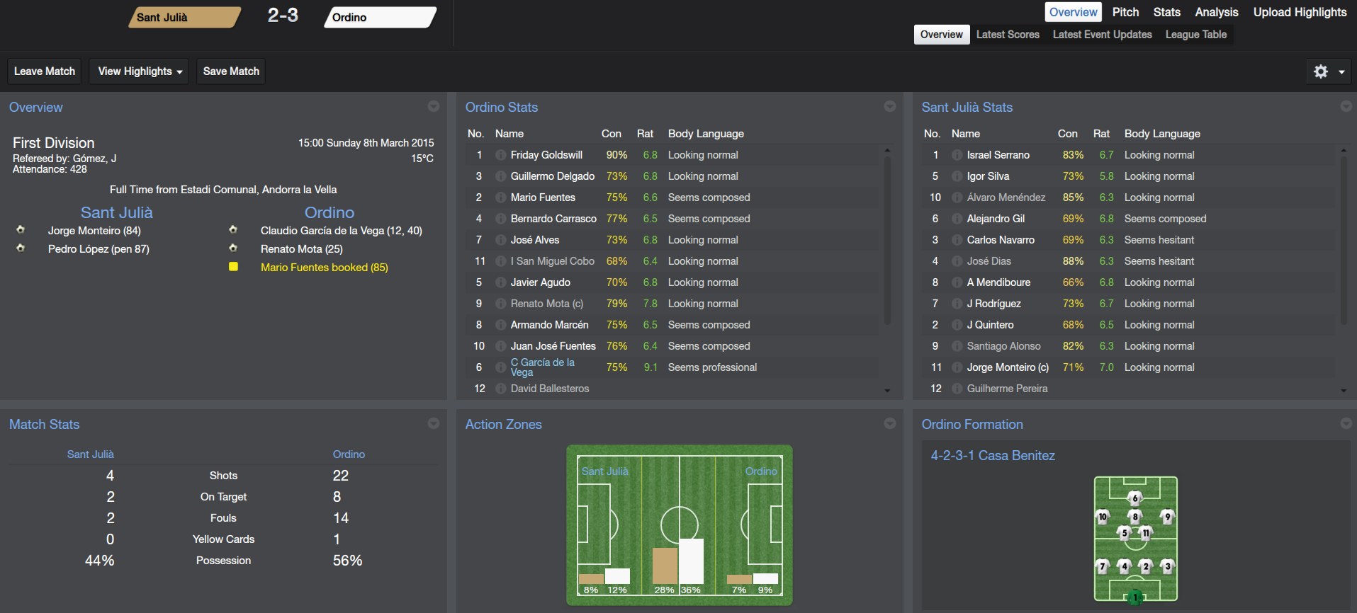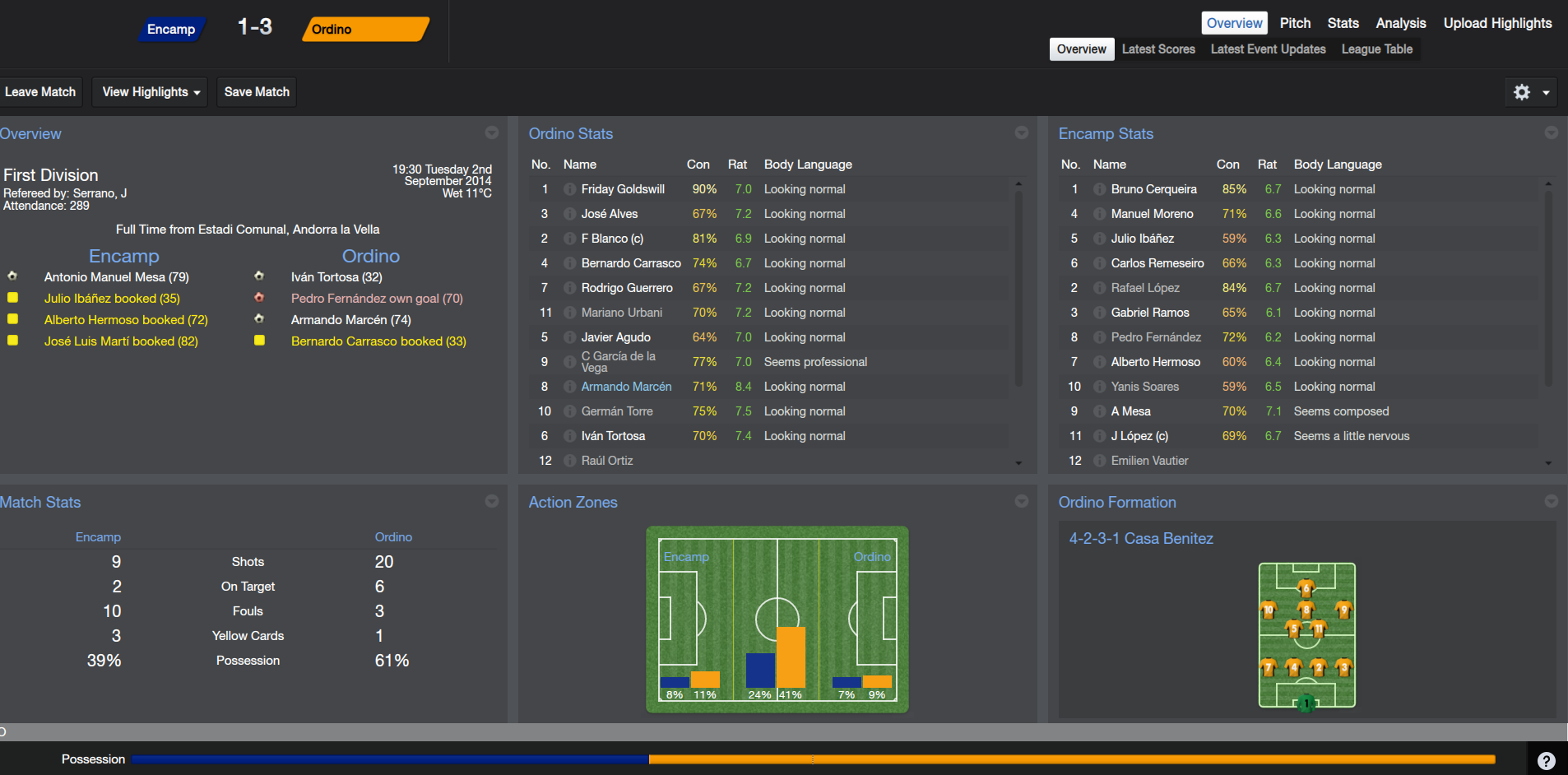 but the ref gave a penalty two minutes later we take the chance to be a goal down at half time. Rallied the boys and sent them out and we smash the doors all the way to 80 mins with no avail but then Marcen picks up a second and a 91st minute winner by Fuentes. Brings us into the title race and leading