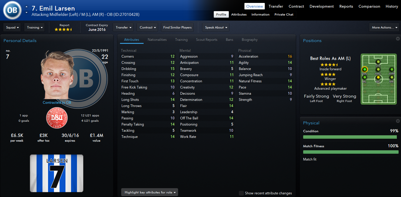 Larsen joined Odense from Lyngby in , for a fee of £400k, and has gone on to make 38 appearances for the club, netting 8 goals in the process. With Dusan Djuric at the club on loan from Valenciennes, Larsen has been playing on the Right Wing of late, but a new formation, and some movement within the squad may be signalling a more central role for the youngster. We picked his brains about everything from pre-match rituals to wether he prefers smoked or unsmoked bacon!